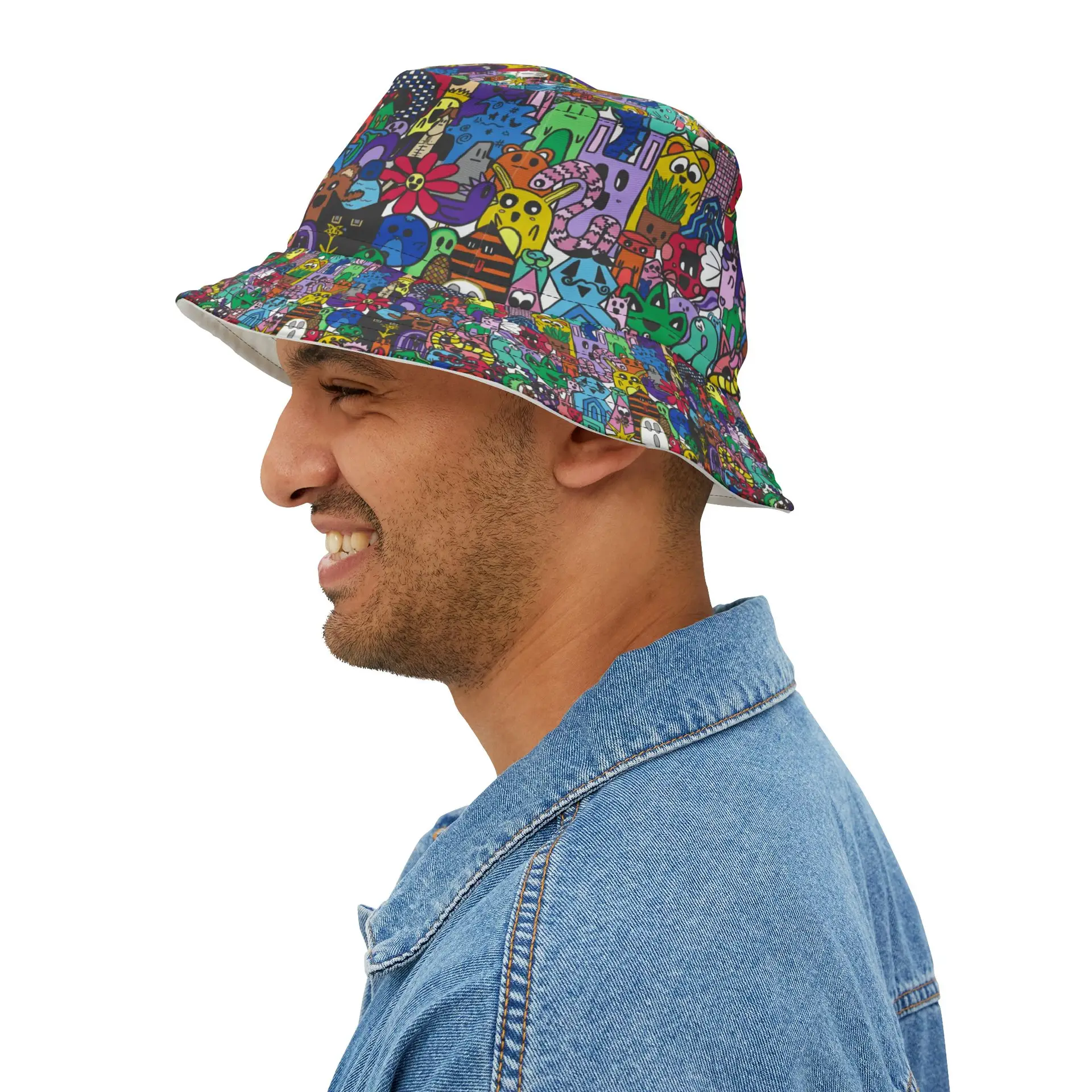 This bucket hat has a colorful all over print from a hand drawing