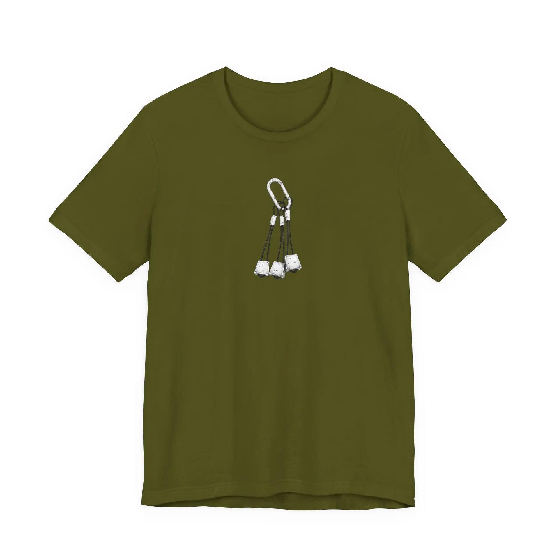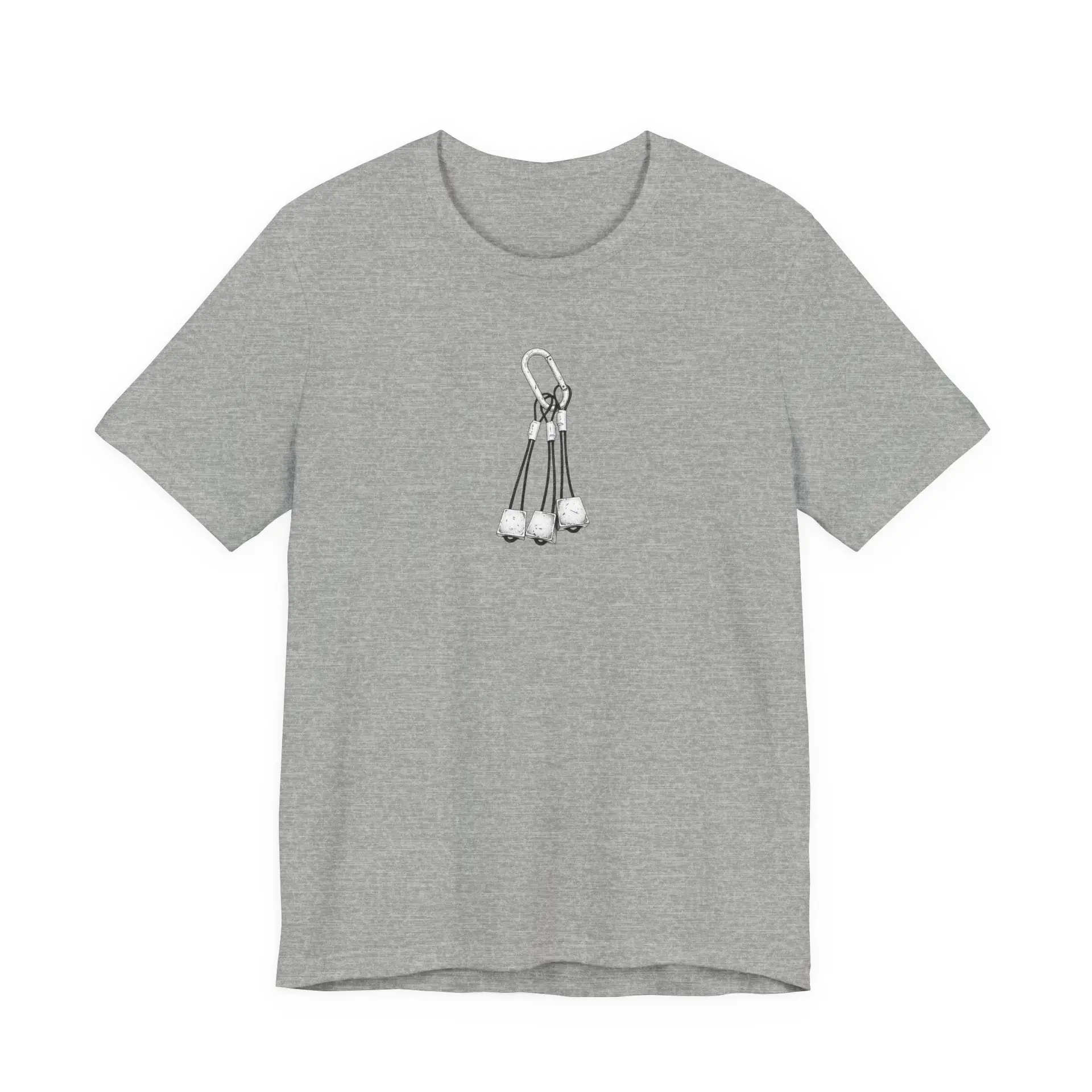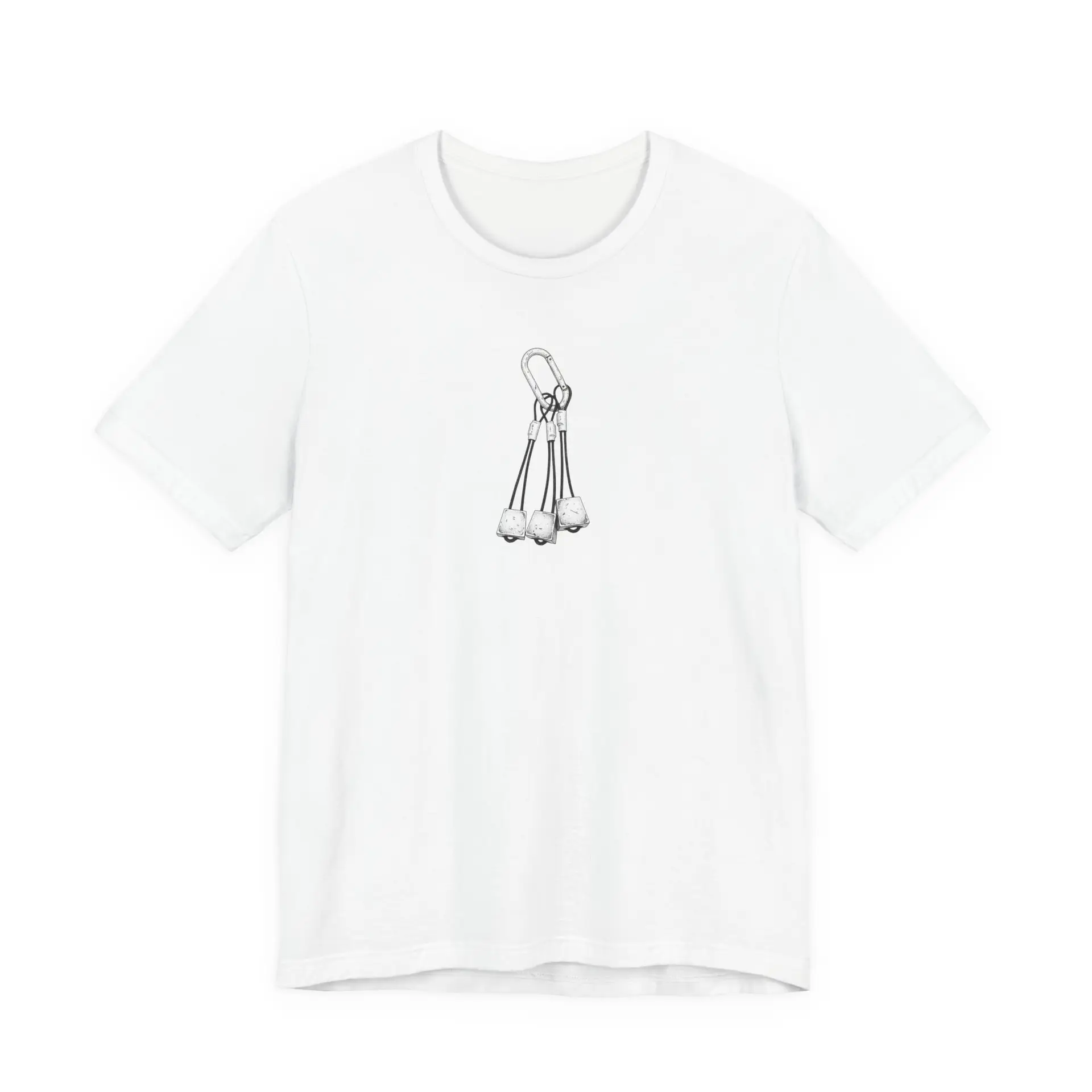 Show your love for climbing with this stylish unisex tee featuring a detailed pen-and-ink illustration of climbing nuts and a carabiner. This comfortable shirt is perfect for climbers and outdoor enthusiasts alike, showcasing a clean and modern aesthetic.