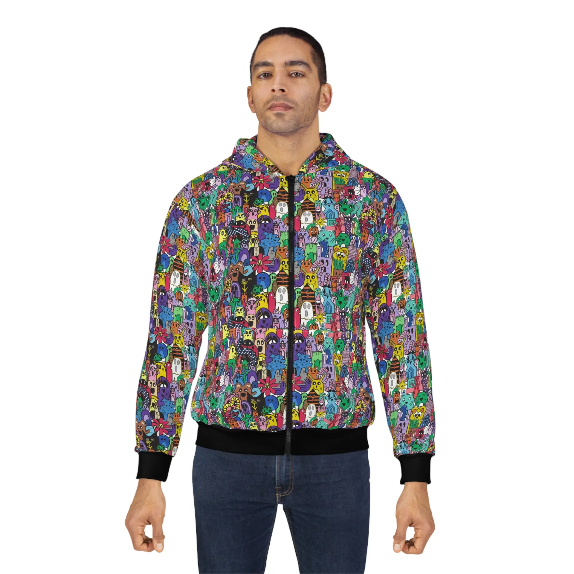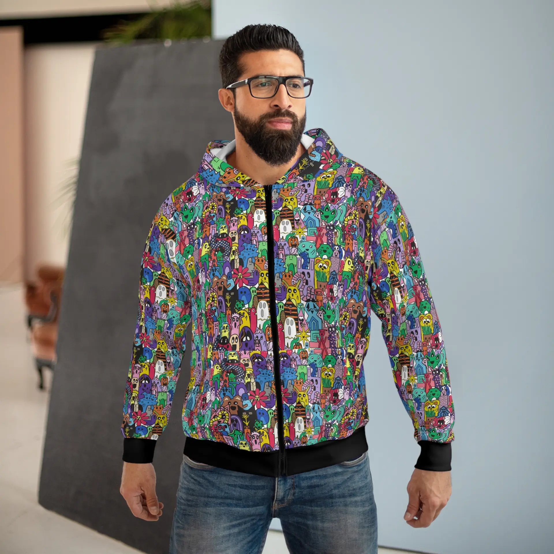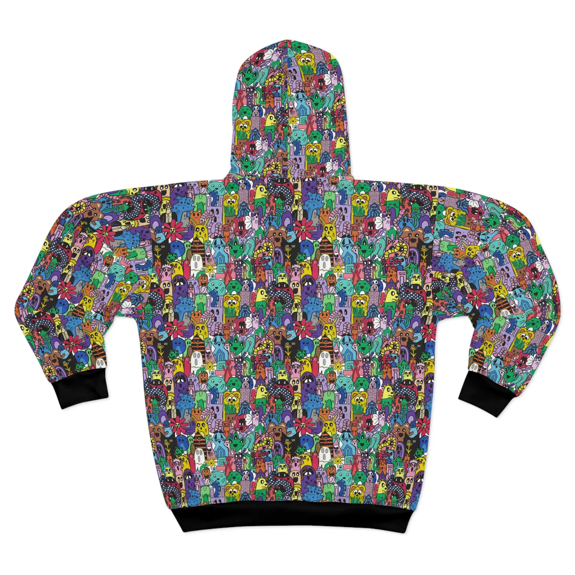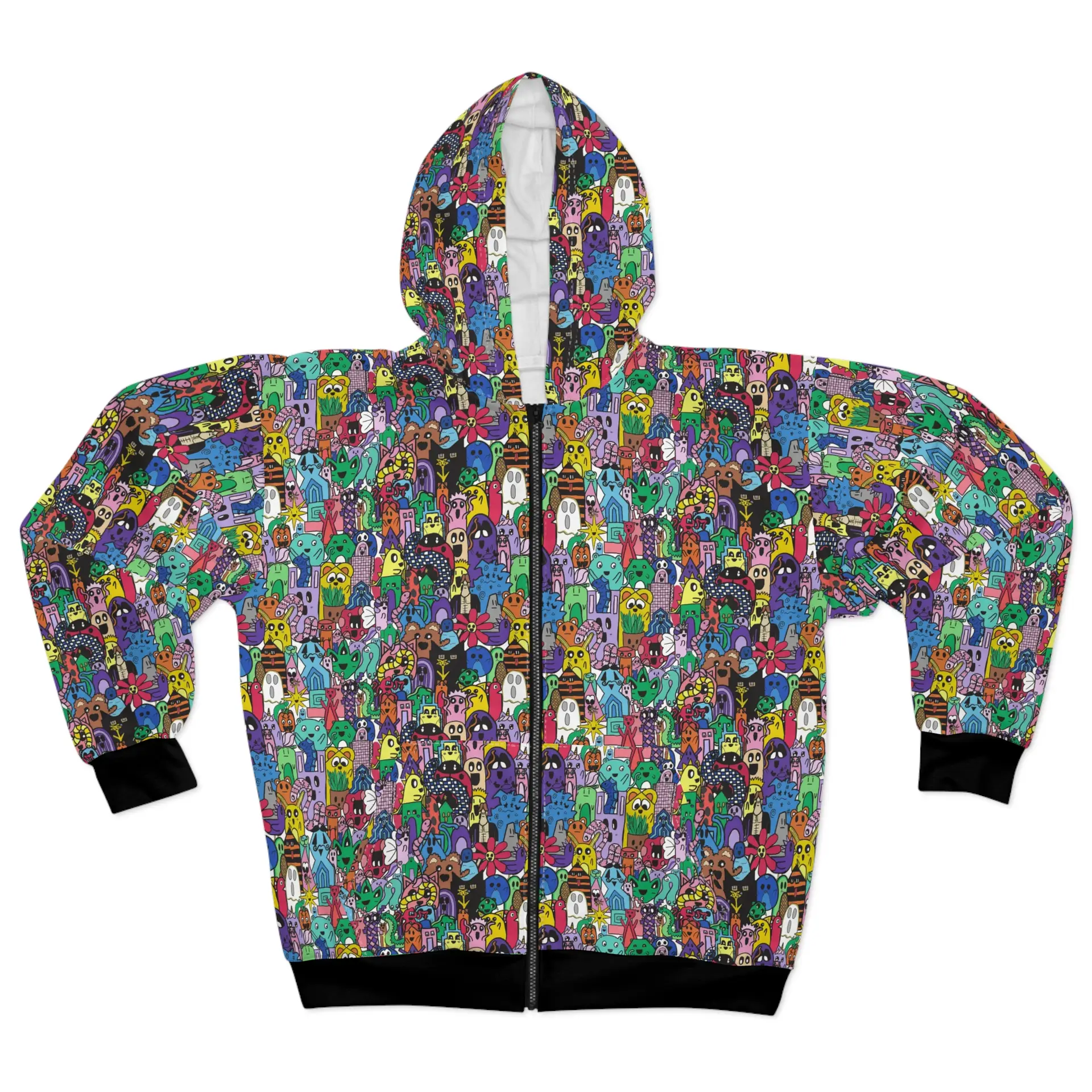 This vibrant all-over print zip hoodie brings a riot of hand-drawn characters to your everyday wardrobe. Lightweight but sturdy, the fabric holds bright, saturated color so every quirky face and tiny detail stays visible wash after wash. The classic fit and roomy front pockets make it easy to layer over tees for crisp mornings or late-night walks. Wear it when you want to stand out without shouting — the pattern sparks smiles and starts conversations, whether you’re heading to a comic meet-up, arcade night, or a weekend of urban sketching. The black trim and zipper add contrast, letting the chaotic cheer of the print take center stage while the construction stays reliable and comfortable.