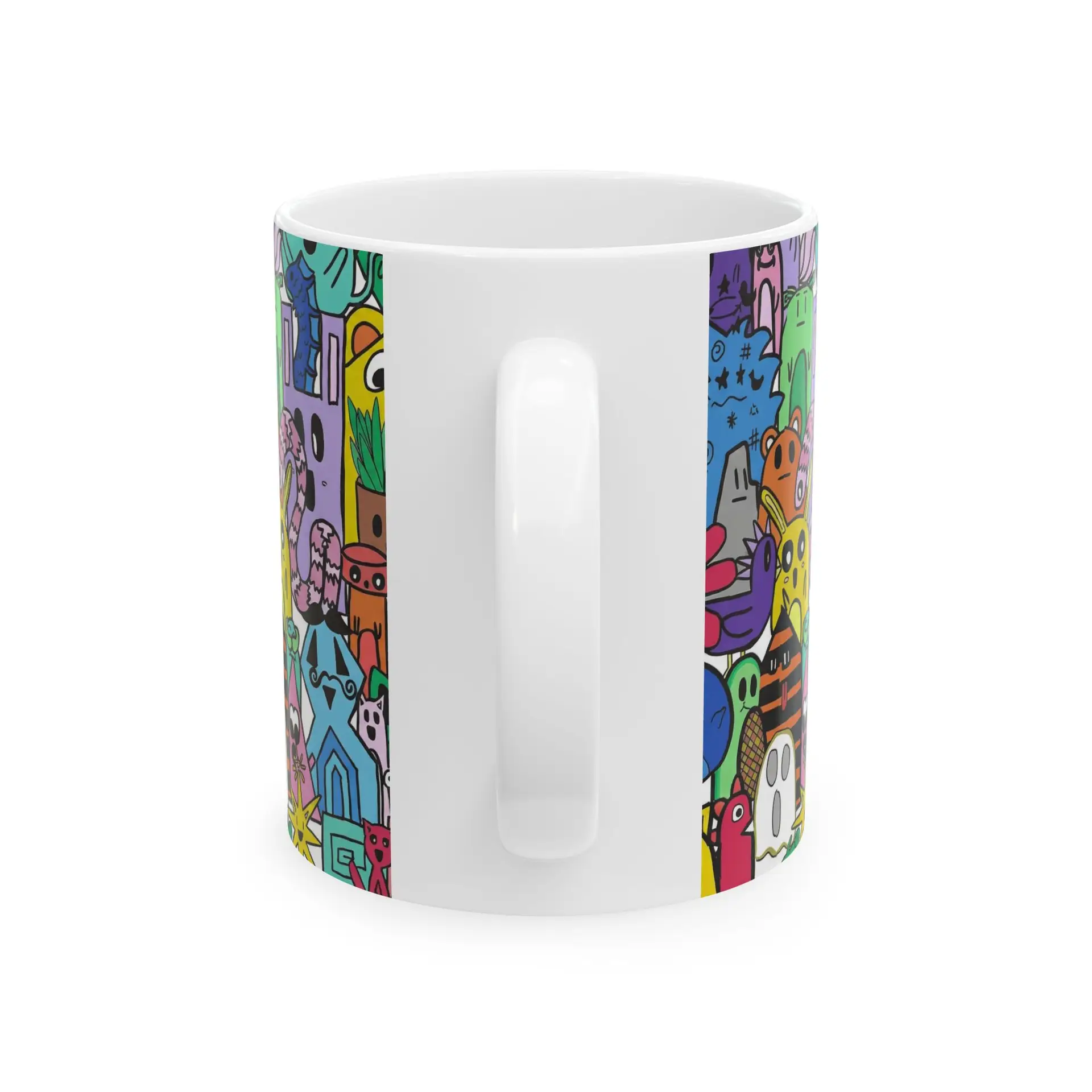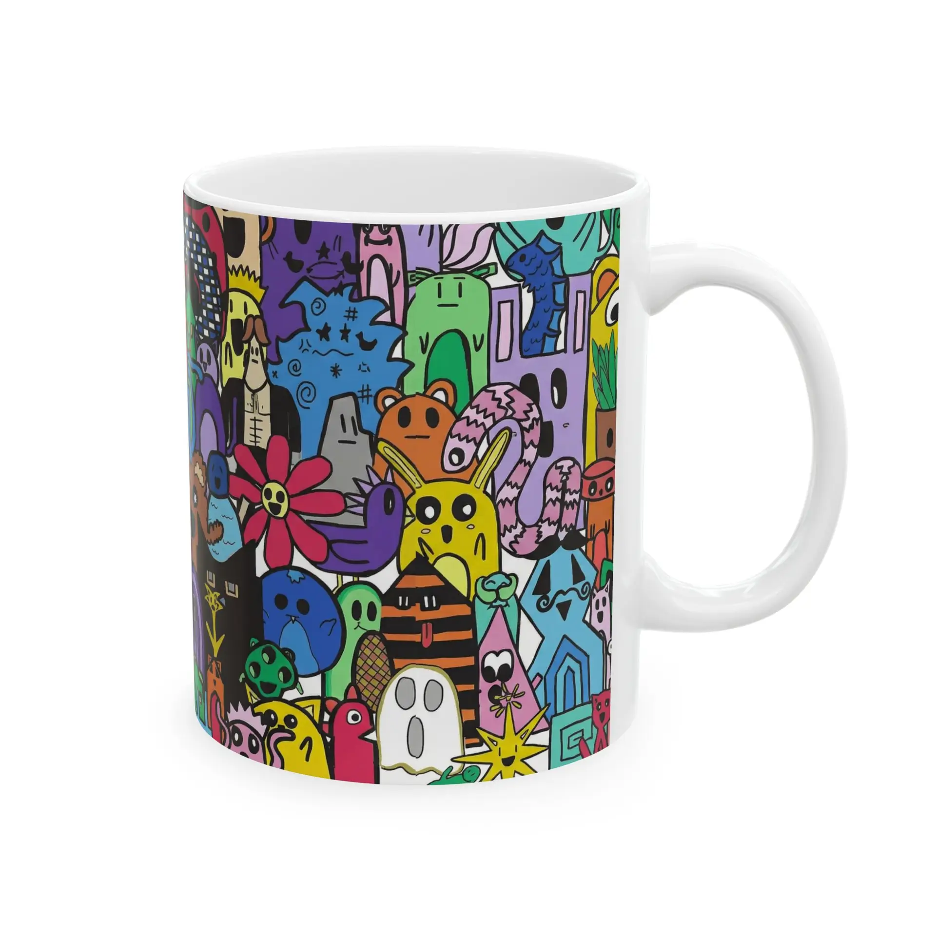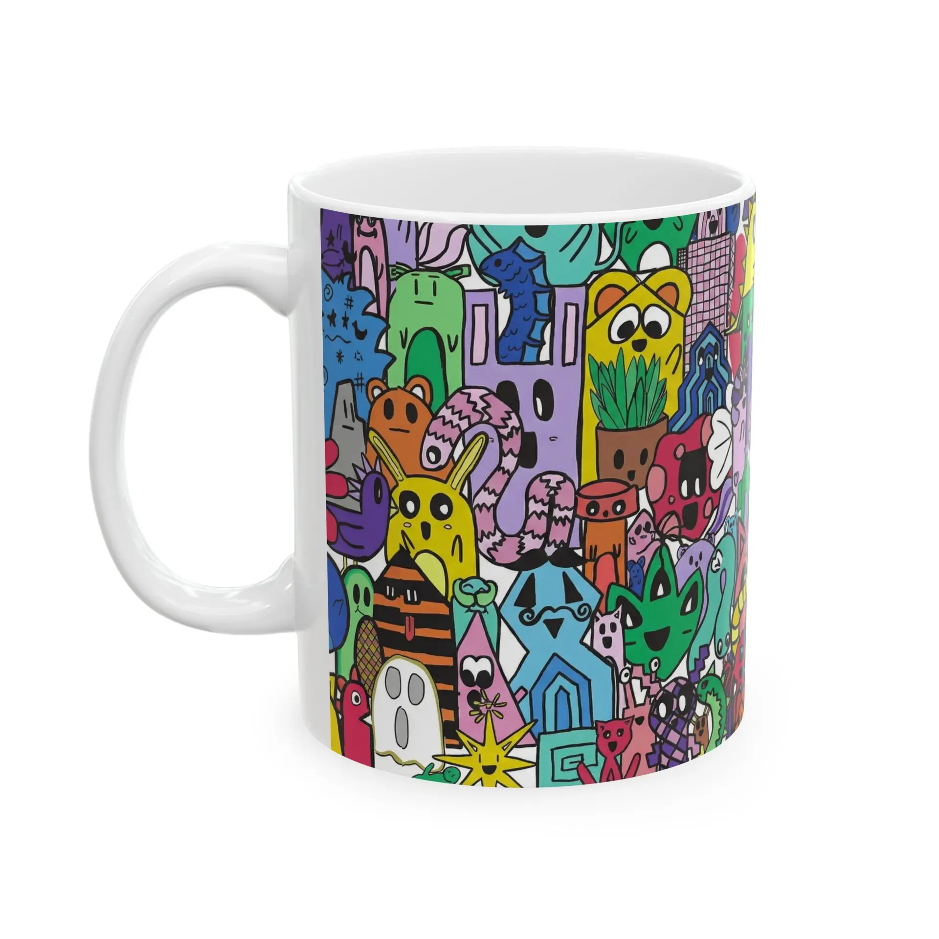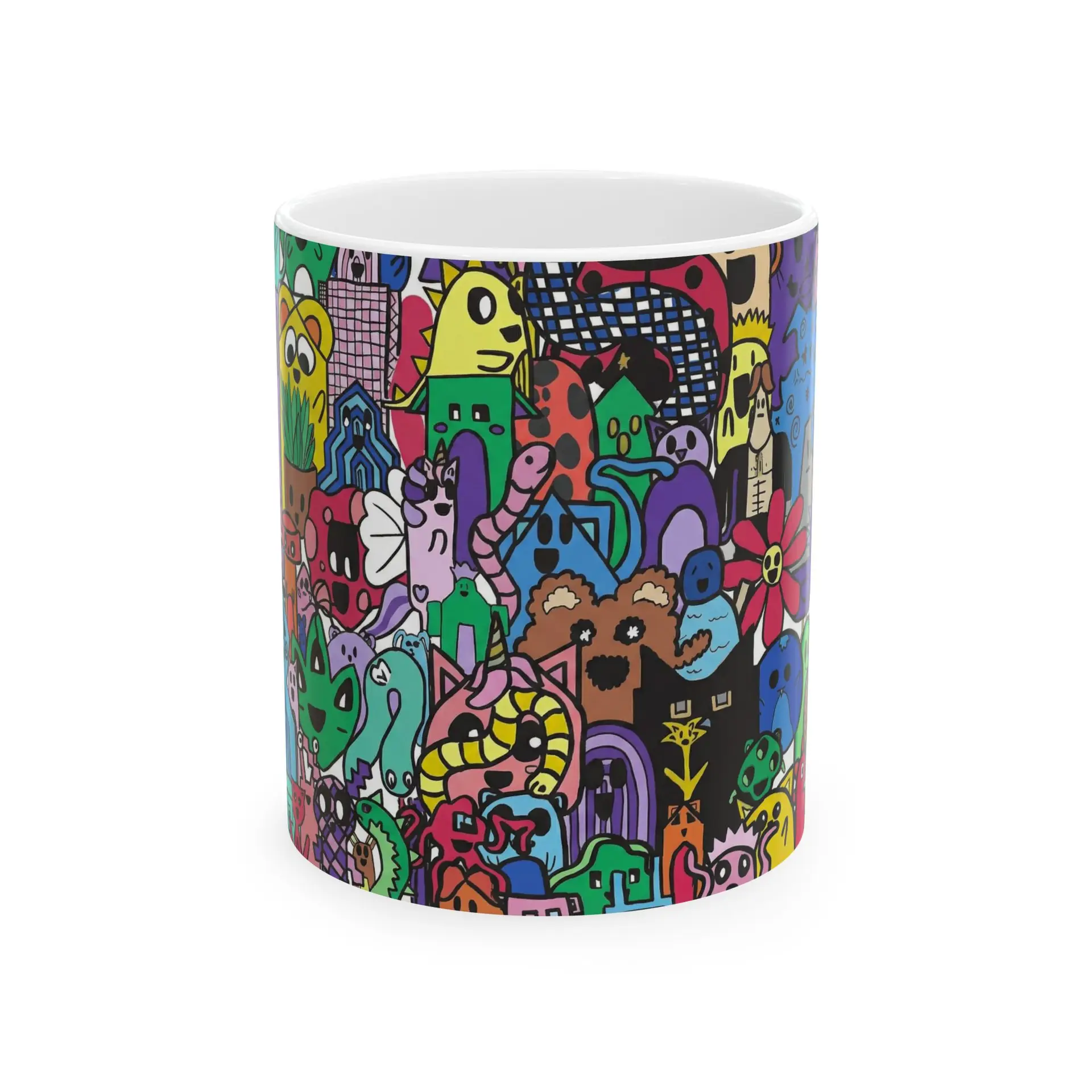 Bright, playful, and full of character — this glossy ceramic mug brings a bustling world of doodled creatures to your morning routine. Each sip becomes a small moment of joy as vivid colors and quirky characters crowd the wraparound print. The comfortable C-handle and shiny finish make it easy to reach for, while durable white ceramic keeps the art popping day after day. Use it as your go-to coffee cup at the desk, a cheerful companion on slow weekend mornings, or a colorful addition to a creative studio shelf. Dishwasher- and microwave-safe, lead- and BPA-free — this mug fits into routines that need a bit more personality and a lot more color.
