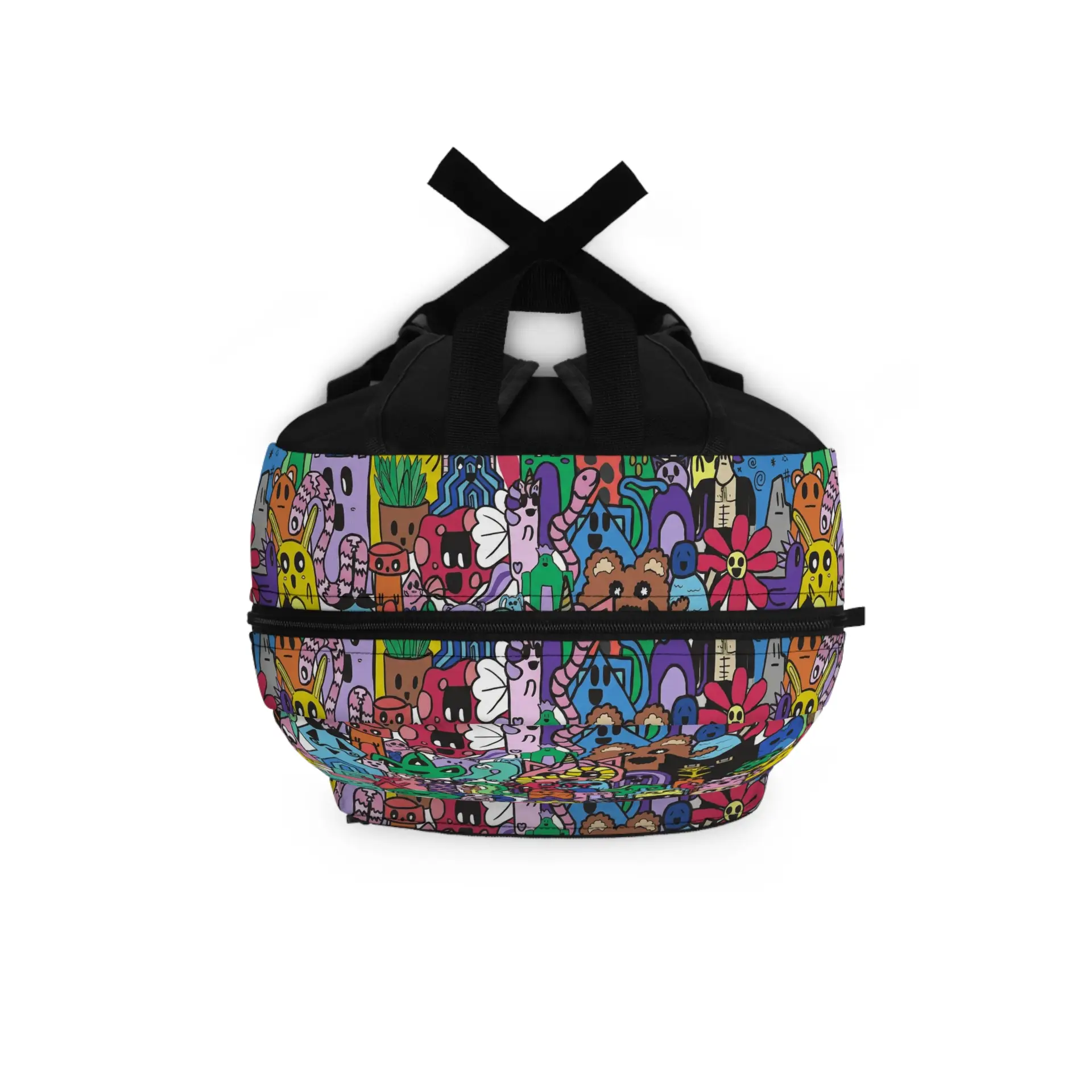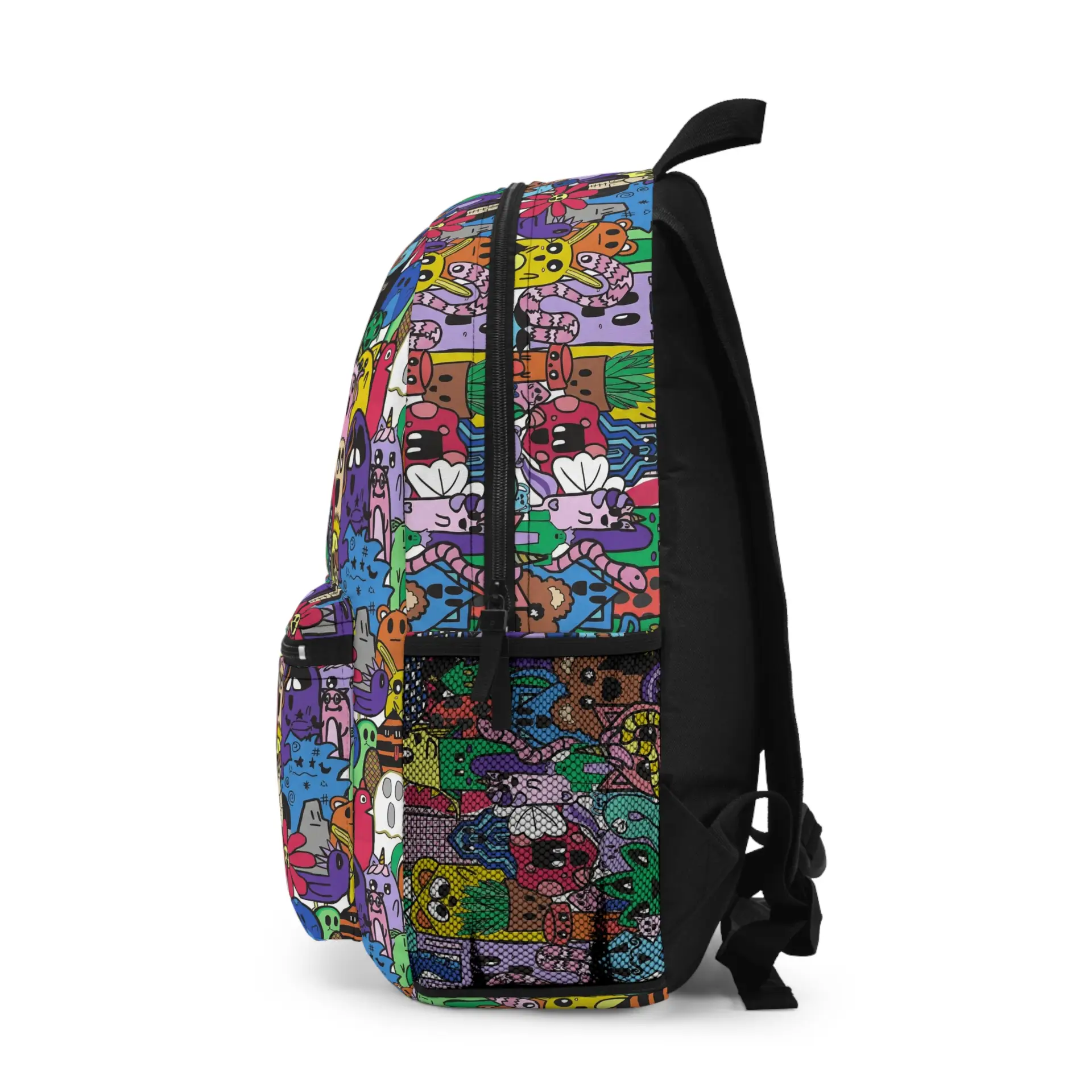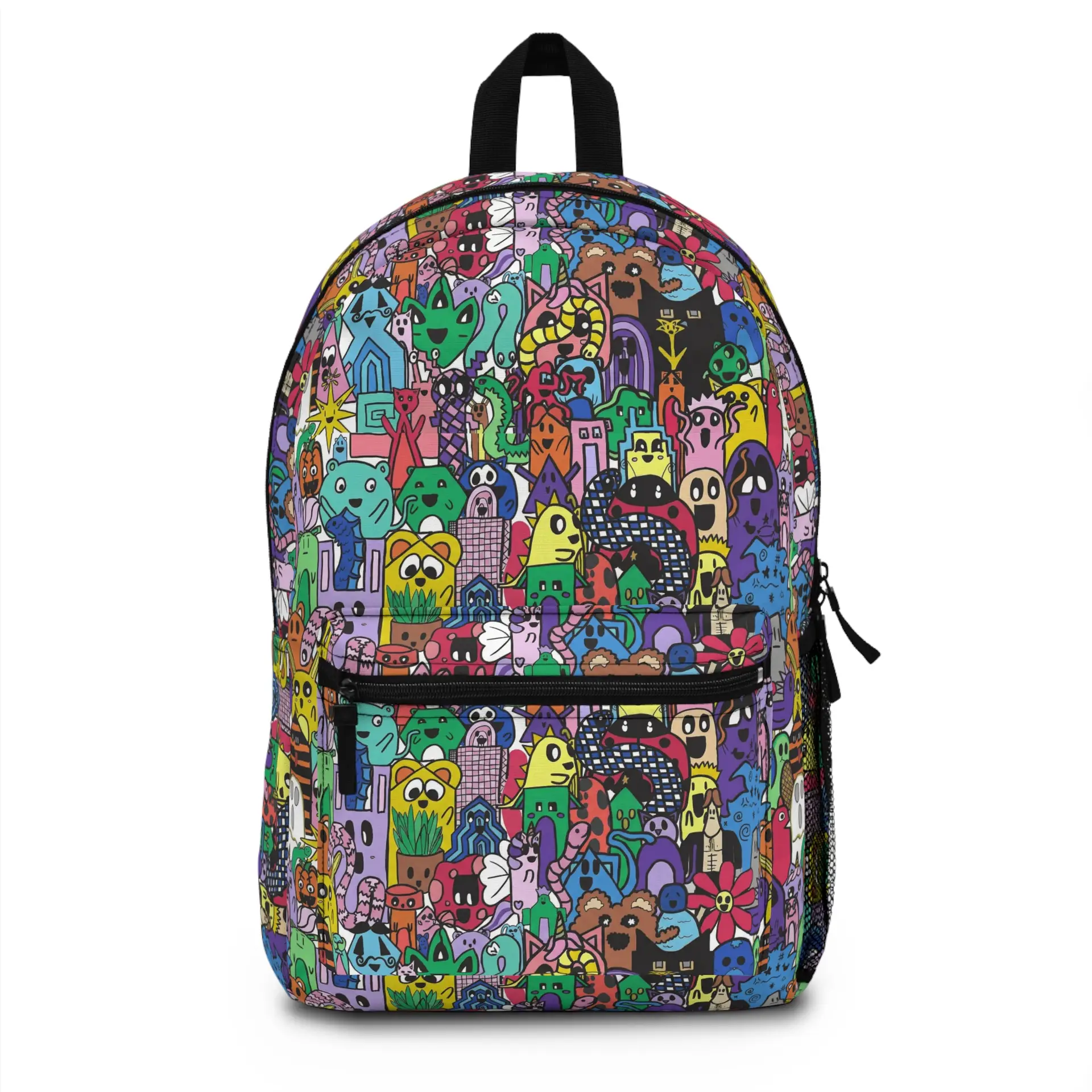 Bright, playful, and endlessly curious — this backpack turns everyday carry into a colorful parade of characters. A dense collage of quirky doodle-critters pops across the fabric in jewel-tone hues, making the bag feel lively whether you’re walking to class, sketching at a cafe, or exploring a weekend market. The padded mesh back and adjustable straps keep it comfy when the day stretches on. Thoughtful pockets — a laptop sleeve, roomy main compartment, front zip pocket and side bottle pocket — keep sketchbooks, chargers, and snacks organized and close at hand. Built tough from lightweight polyester and assembled in the USA, it’s ready for daily adventures and creative commutes.