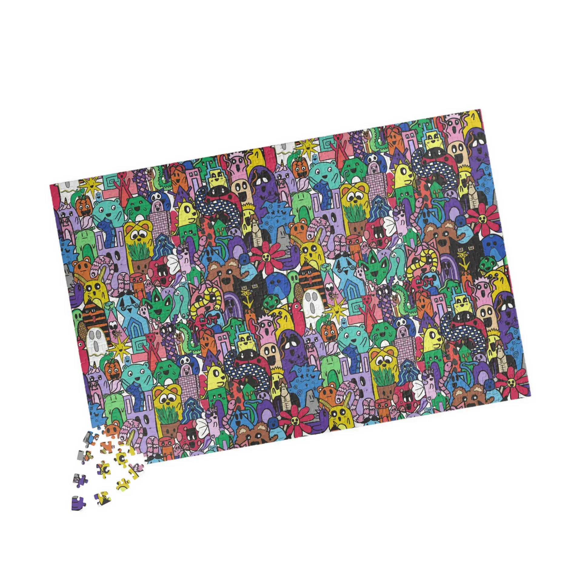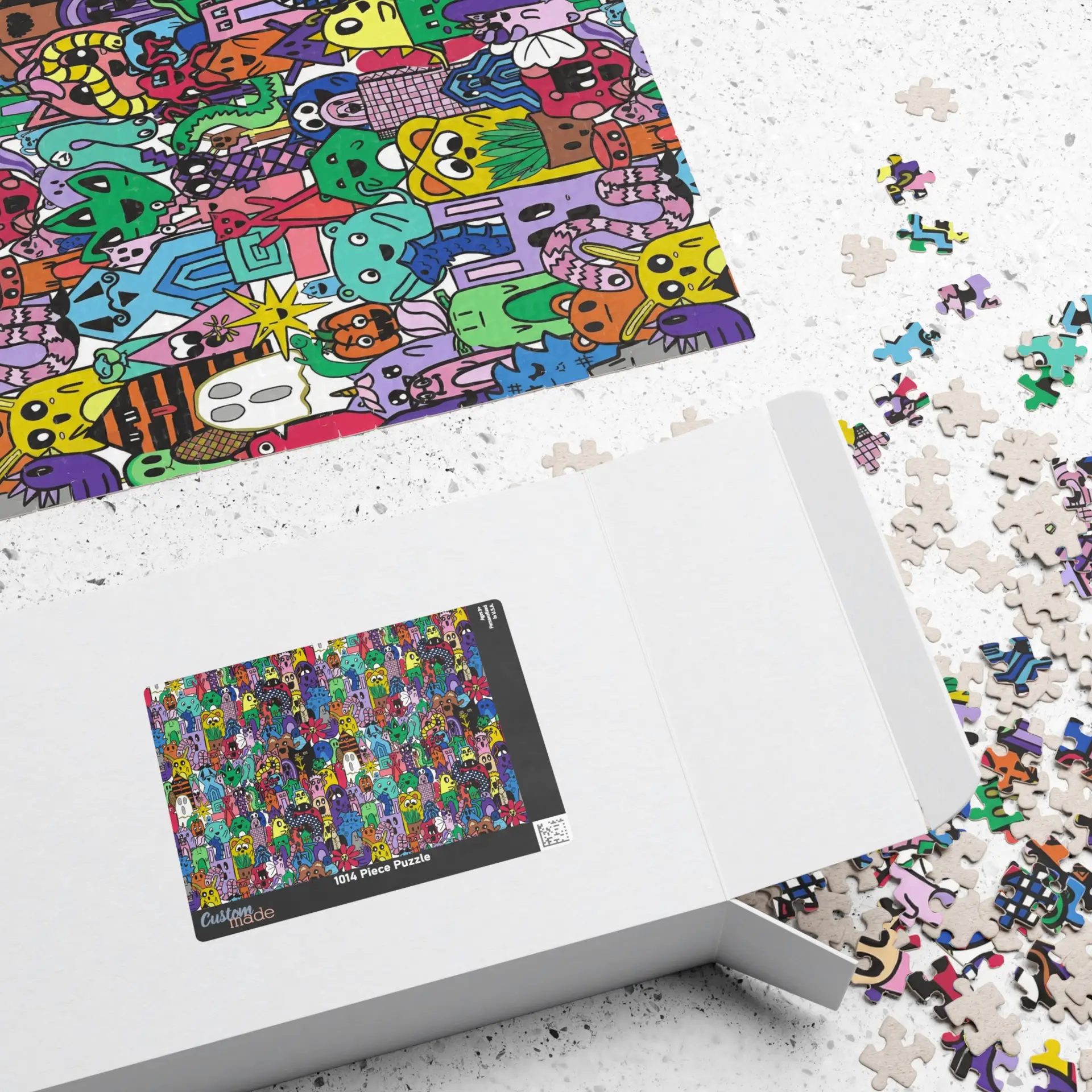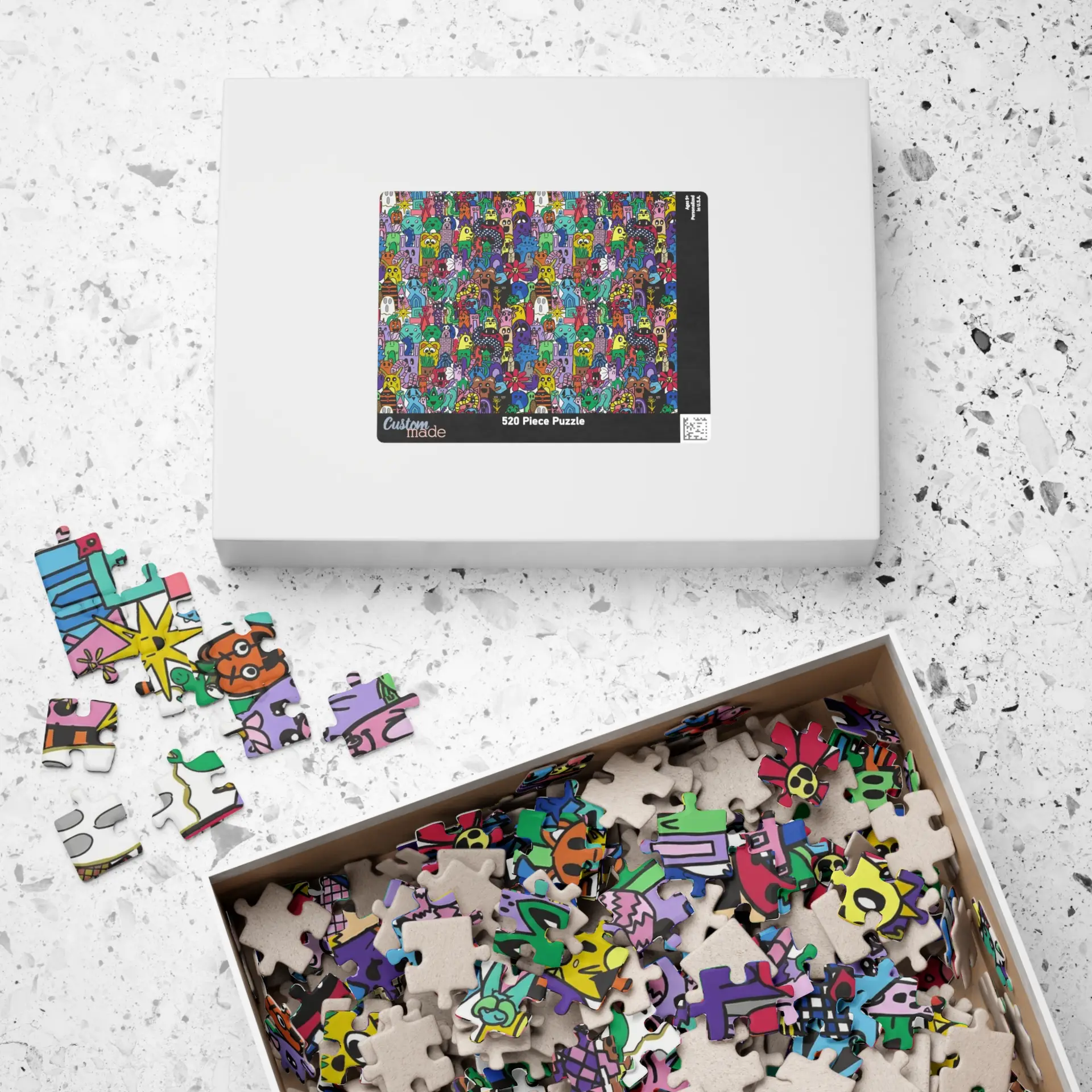 Bring a riot of color and character to quiet nights and rainy afternoons with this illustrated chipboard puzzle. Packed with tiny, playful characters and hidden little details, each piece invites slow focus and small discoveries. The glossy laminated print keeps colors bright and the paper box shows the artwork so you always have the picture to refer to. Choose from two piece counts to match your patience level — 520-piece session, or a longer 1014-piece challenge. Lay it out on the table, play mellow music, and let the pattern emerge one quirky creature at a time.