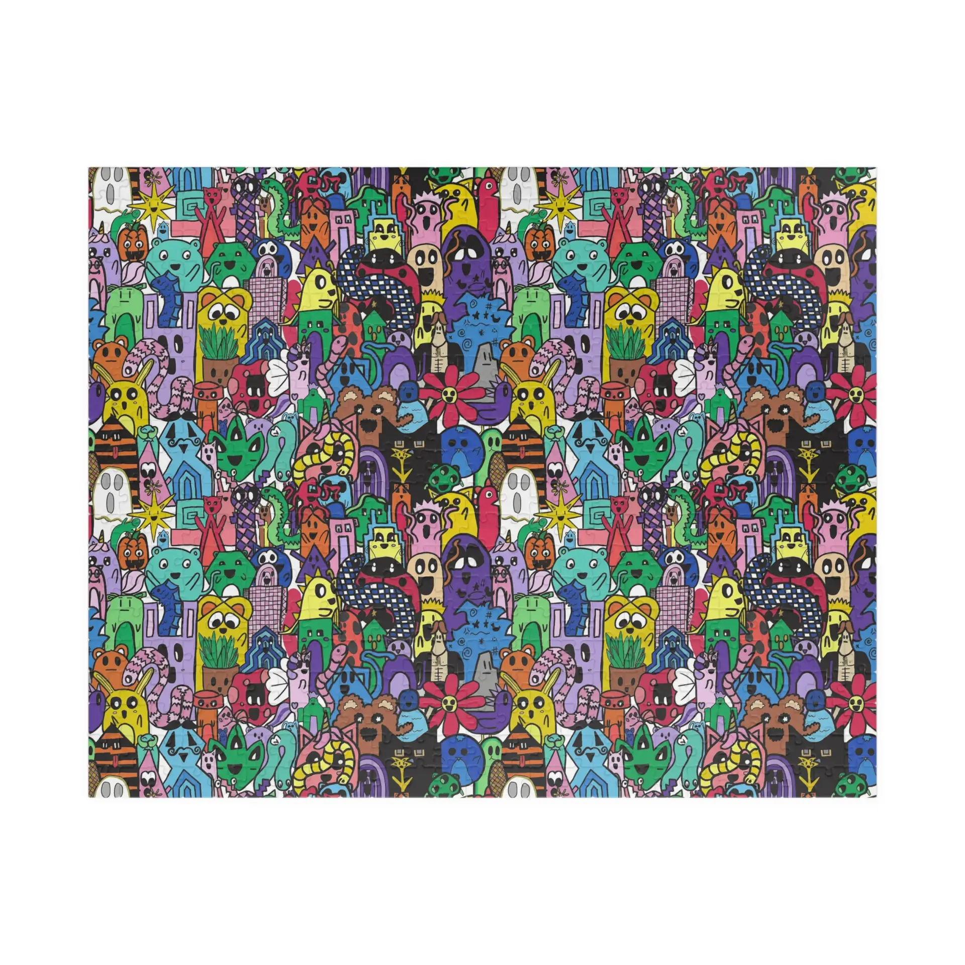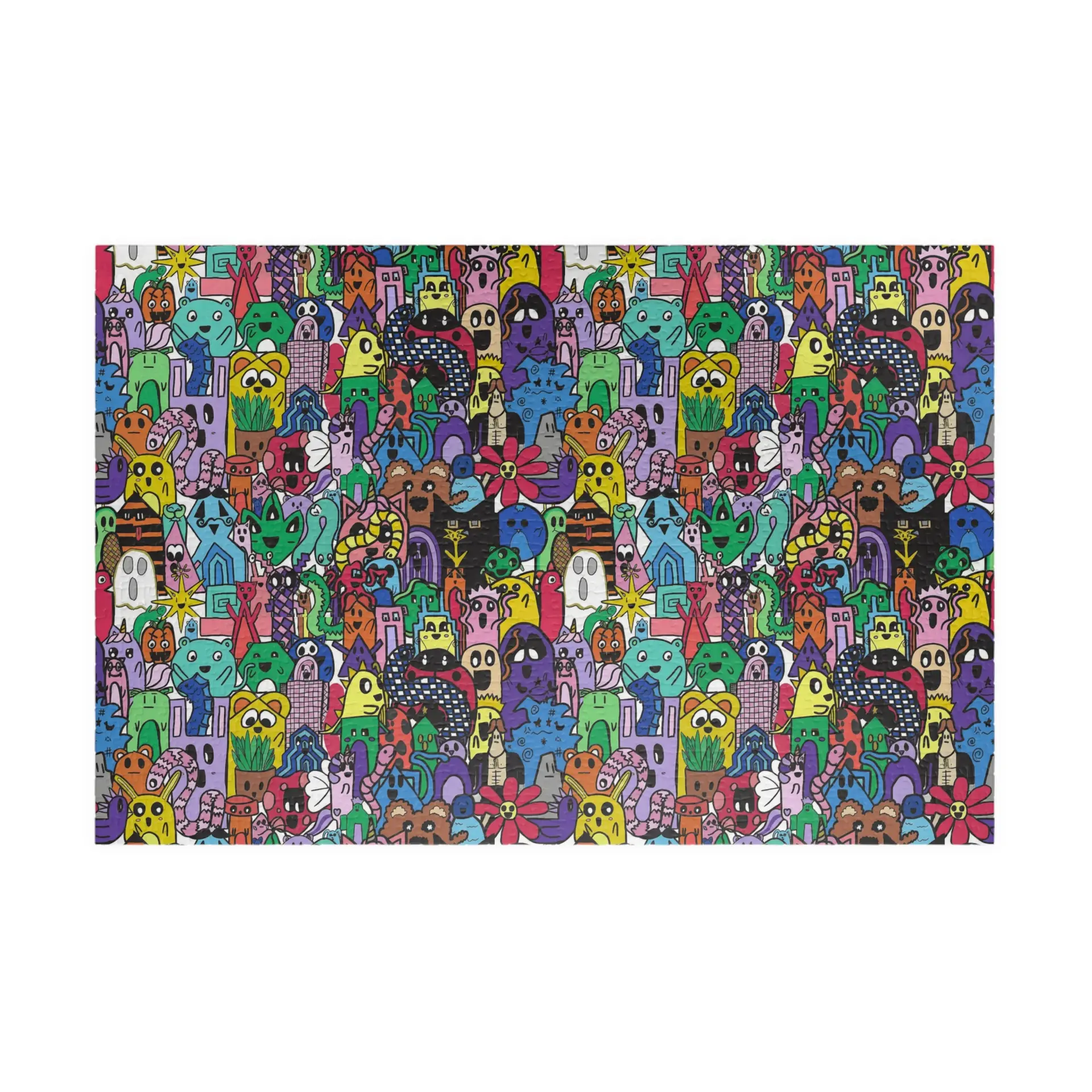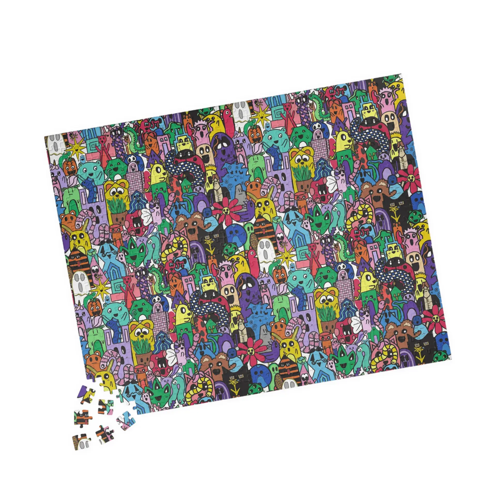 Bring a riot of color and character to quiet nights and rainy afternoons with this illustrated chipboard puzzle. Packed with tiny, playful characters and hidden little details, each piece invites slow focus and small discoveries. The glossy laminated print keeps colors bright and the paper box shows the artwork so you always have the picture to refer to. Choose from two piece counts to match your patience level — 520-piece session, or a longer 1014-piece challenge. Lay it out on the table, play mellow music, and let the pattern emerge one quirky creature at a time.