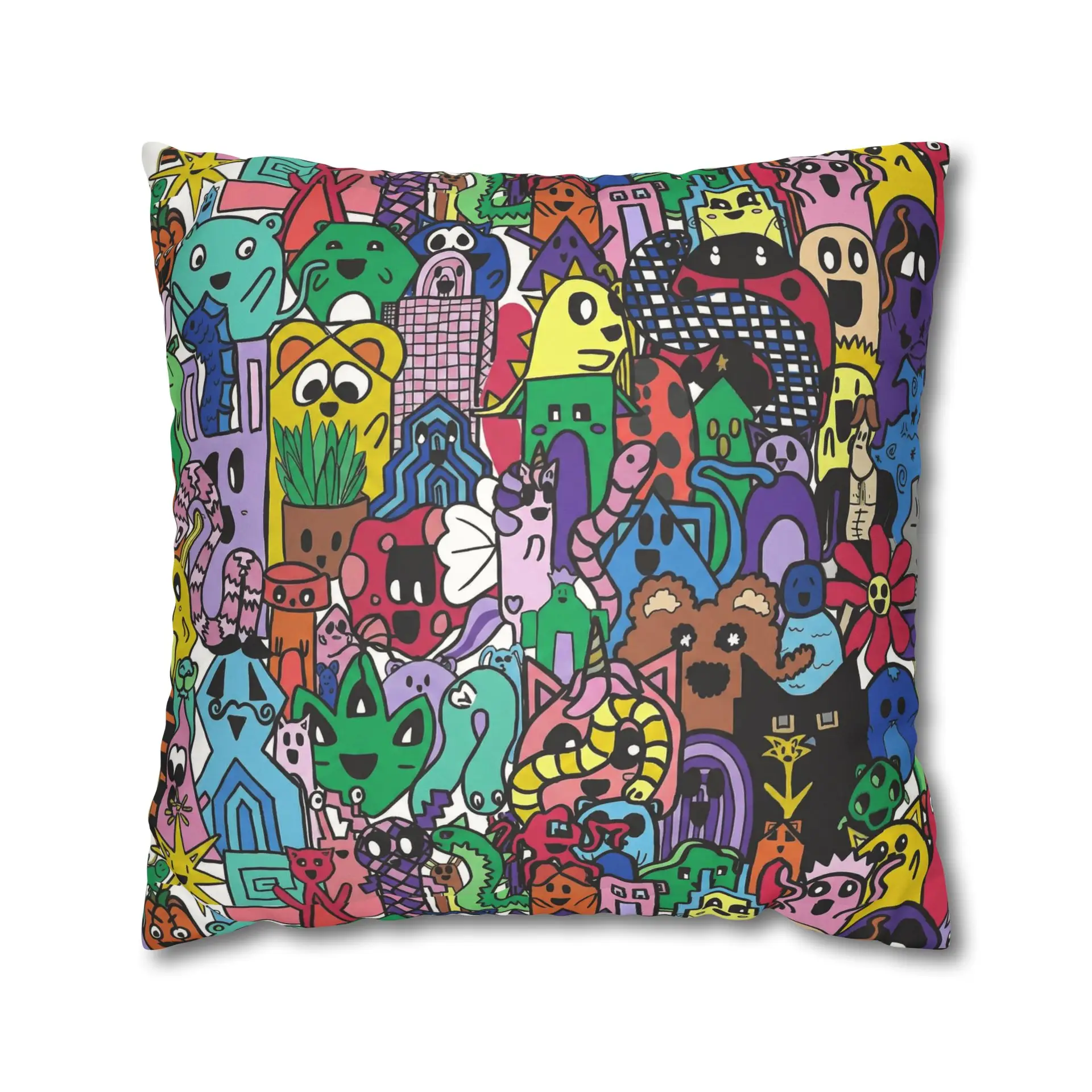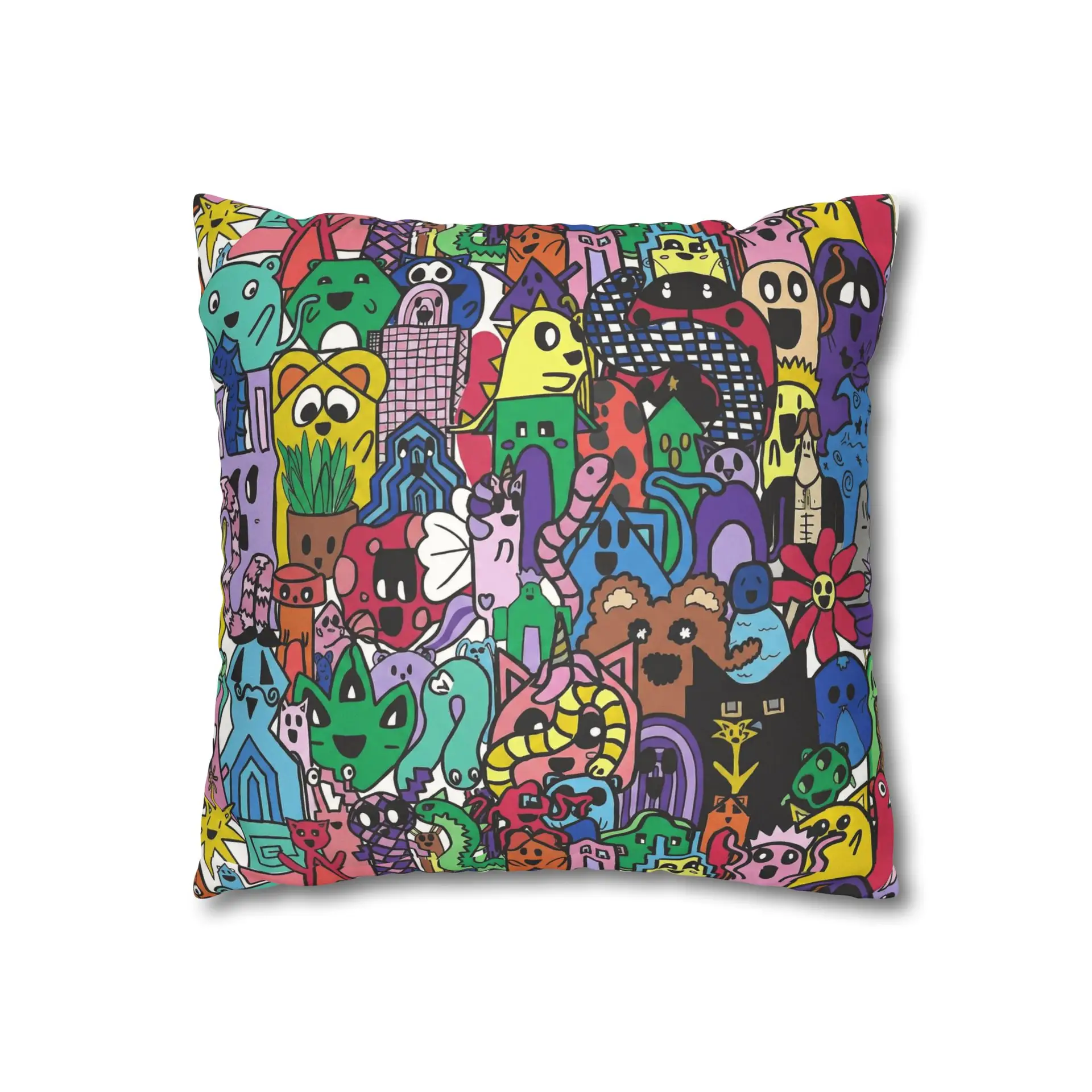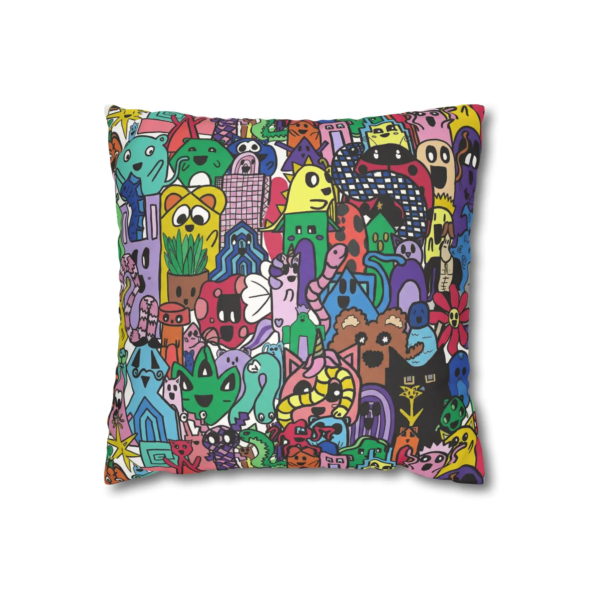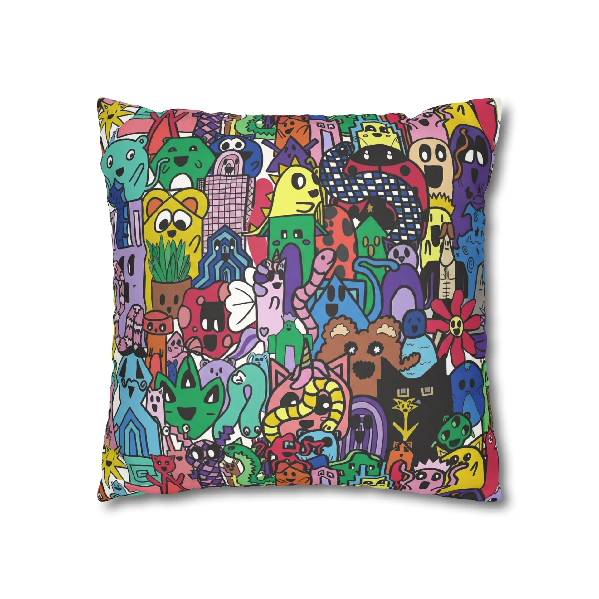 Bright, lively, and full of character — this faux suede square pillowcase brings a playful, illustrated world to your living space. The double-sided print wraps a chaotic crowd of quirky creatures and doodled details in vivid, saturated color, while the soft faux suede surface invites touch and adds a warm, velvety feel. Slip it over a slightly larger insert for a plump finish and let it anchor a casual couch, a cozy reading nook, or a vibrant bedroom. The concealed beige zipper keeps the look seamless, and the durable polyester microfiber holds color and texture wash after wash. This pillowcase fits into everyday life as a joyful accent that sparks smiles and starts conversations.
