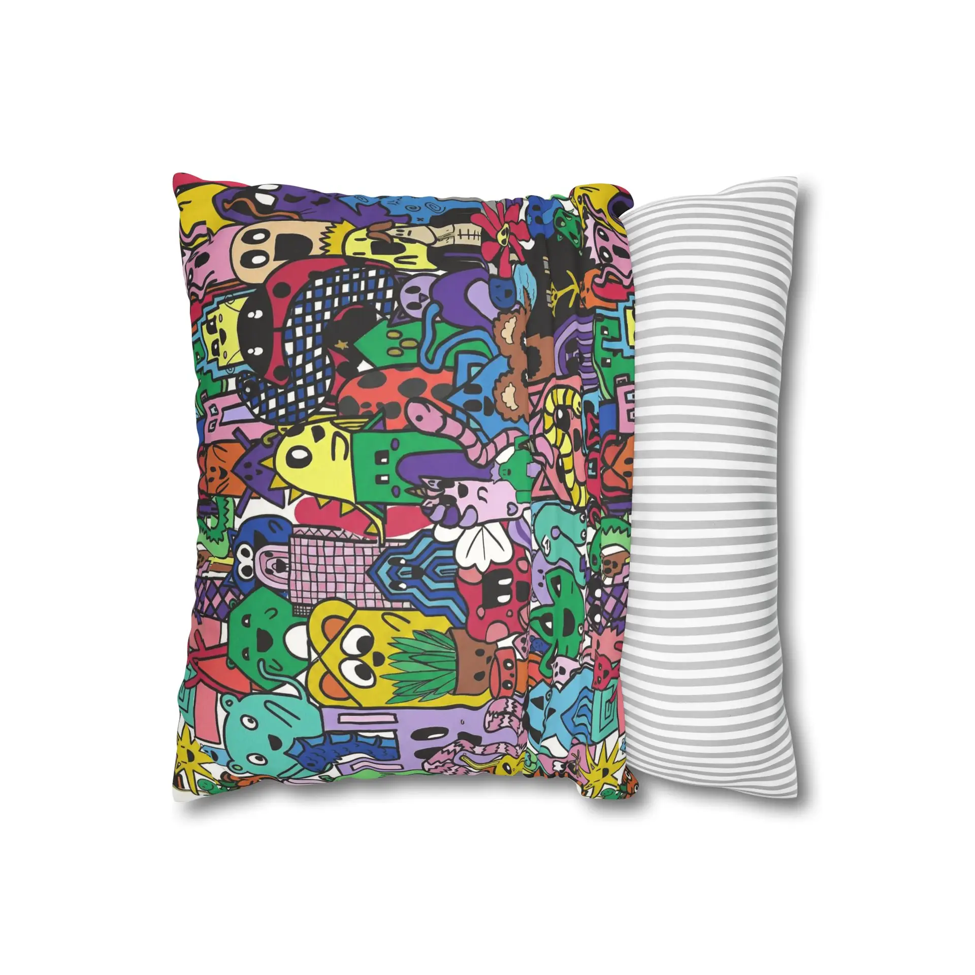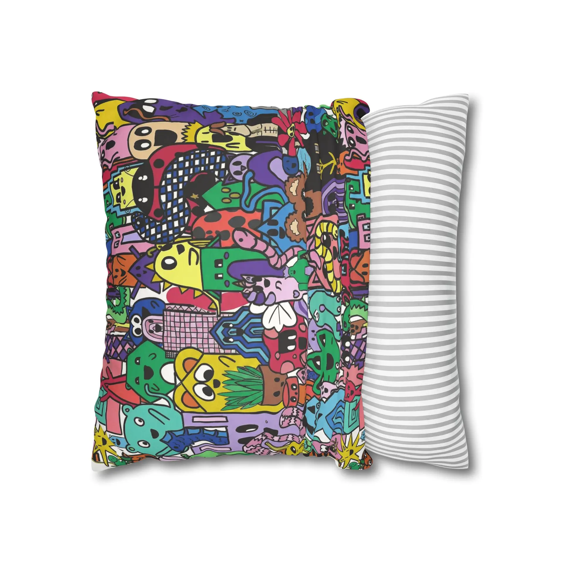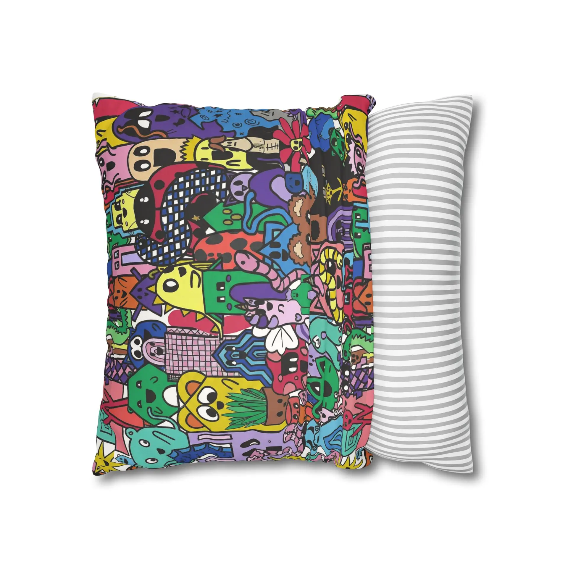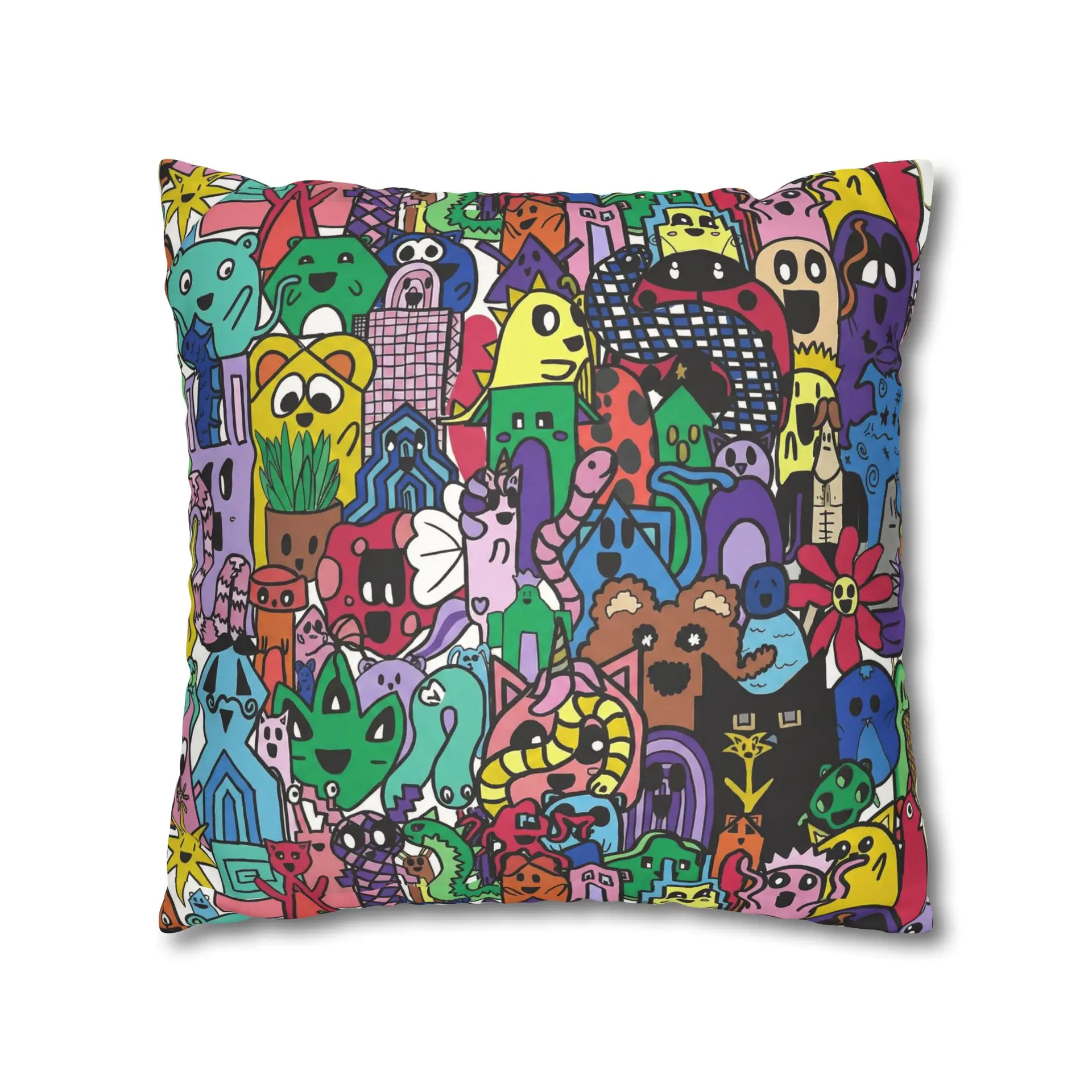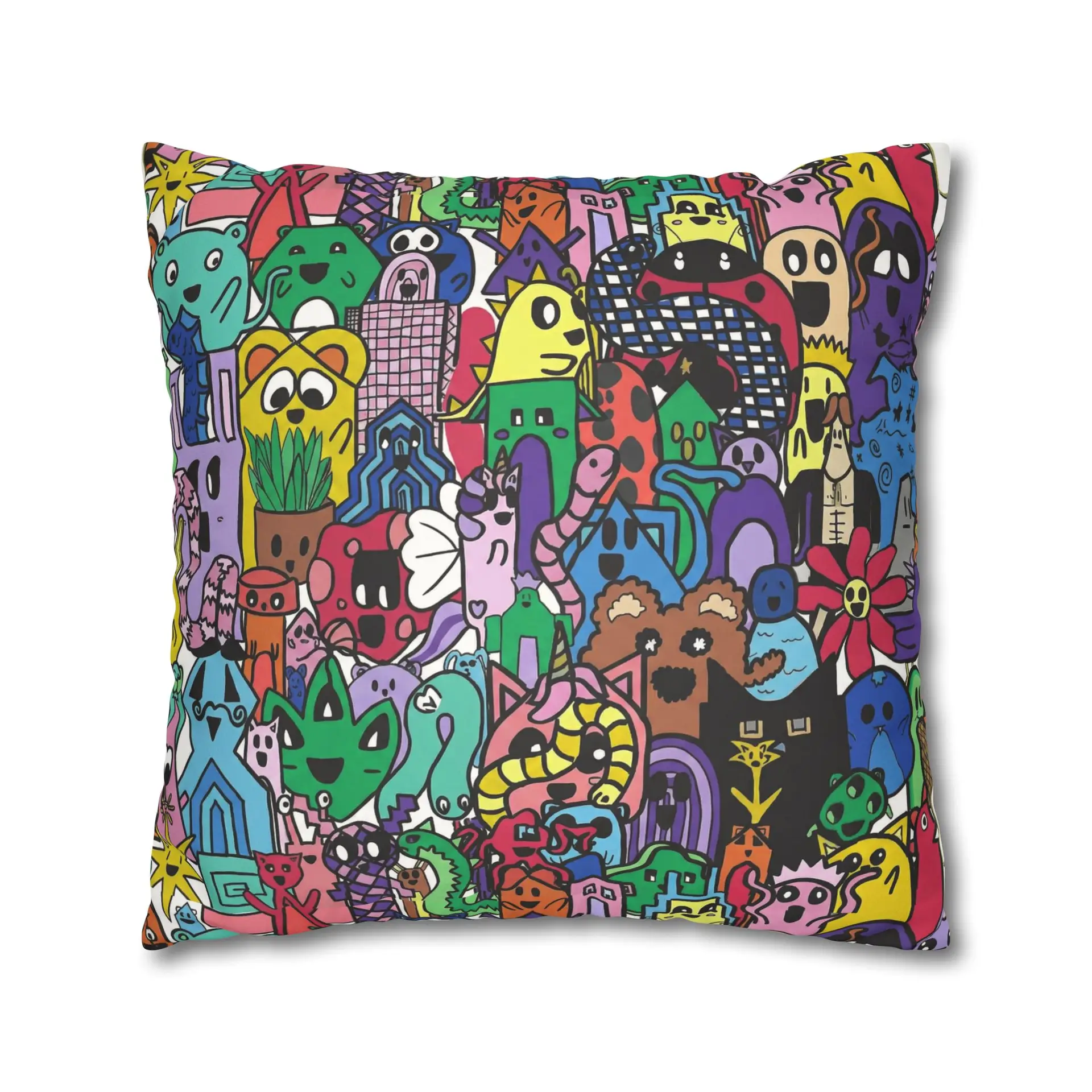 Bright, lively, and full of character — this faux suede square pillowcase brings a playful, illustrated world to your living space. The double-sided print wraps a chaotic crowd of quirky creatures and doodled details in vivid, saturated color, while the soft faux suede surface invites touch and adds a warm, velvety feel. Slip it over a slightly larger insert for a plump finish and let it anchor a casual couch, a cozy reading nook, or a vibrant bedroom. The concealed beige zipper keeps the look seamless, and the durable polyester microfiber holds color and texture wash after wash. This pillowcase fits into everyday life as a joyful accent that sparks smiles and starts conversations.