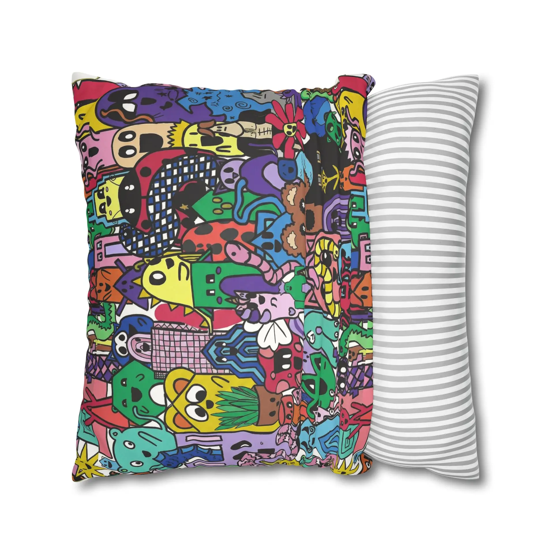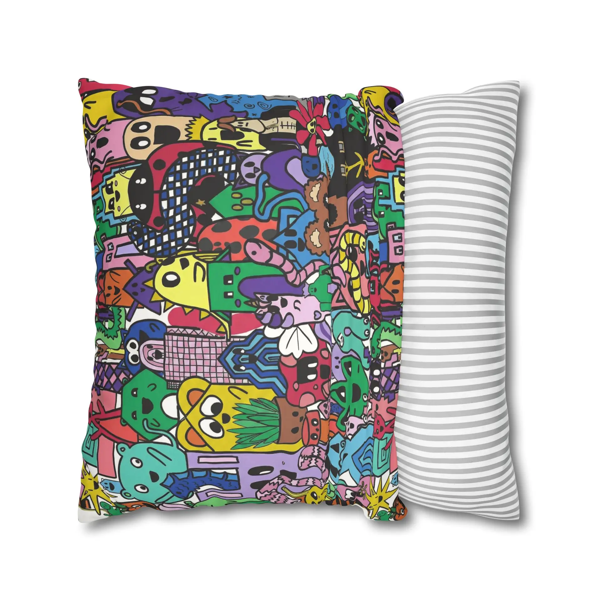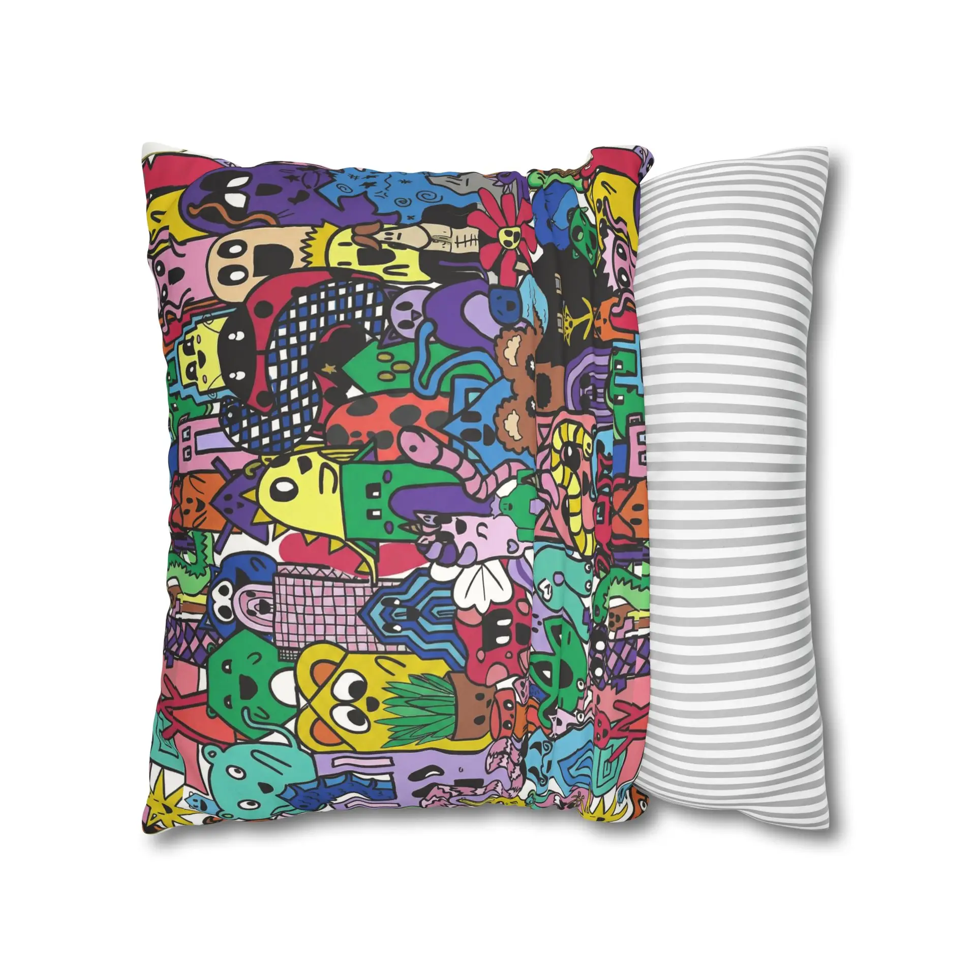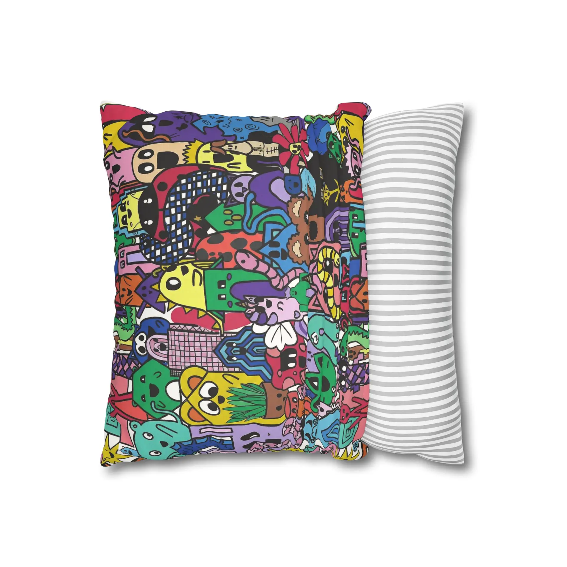 Bright, lively, and full of character — this faux suede square pillowcase brings a playful, illustrated world to your living space. The double-sided print wraps a chaotic crowd of quirky creatures and doodled details in vivid, saturated color, while the soft faux suede surface invites touch and adds a warm, velvety feel. Slip it over a slightly larger insert for a plump finish and let it anchor a casual couch, a cozy reading nook, or a vibrant bedroom. The concealed beige zipper keeps the look seamless, and the durable polyester microfiber holds color and texture wash after wash. This pillowcase fits into everyday life as a joyful accent that sparks smiles and starts conversations.