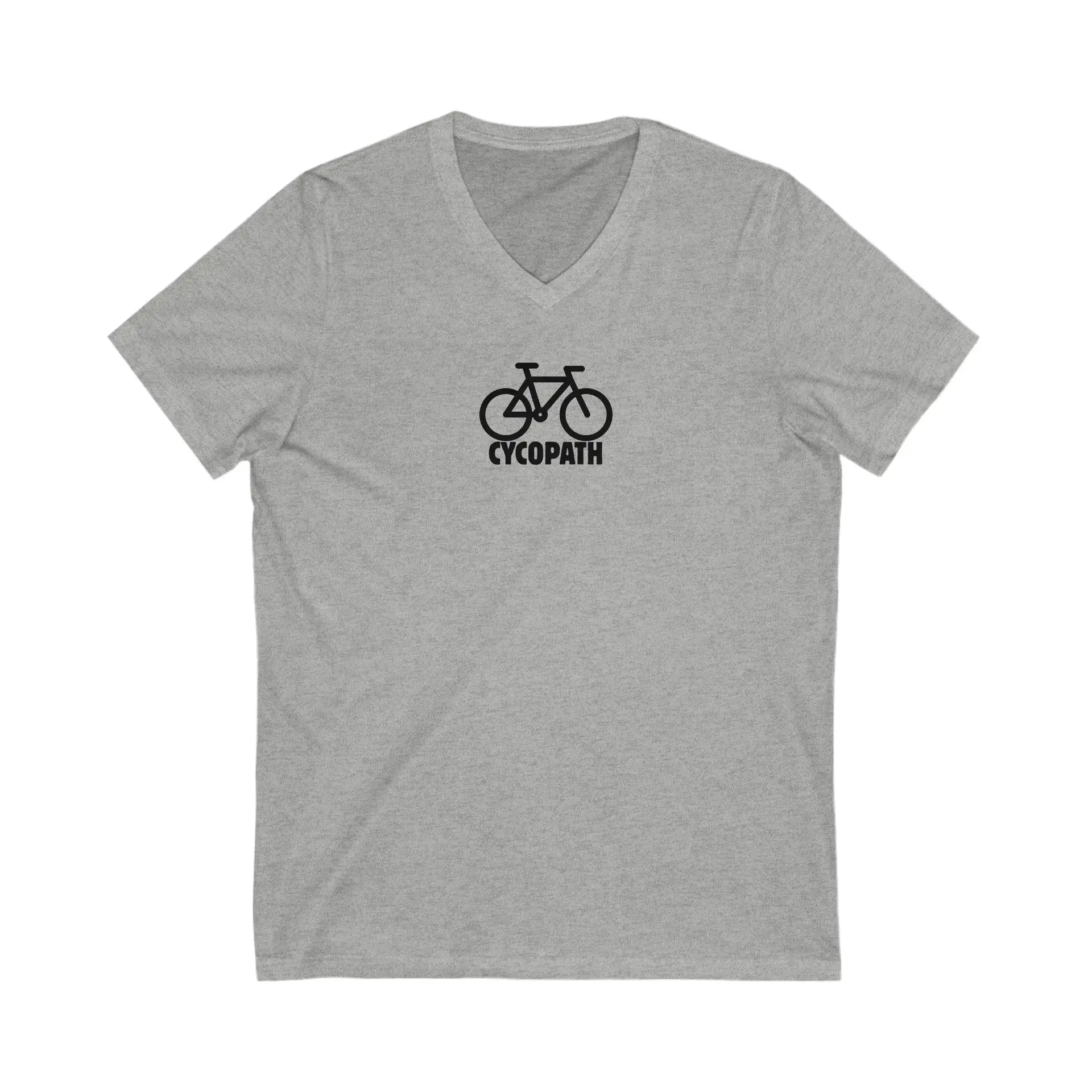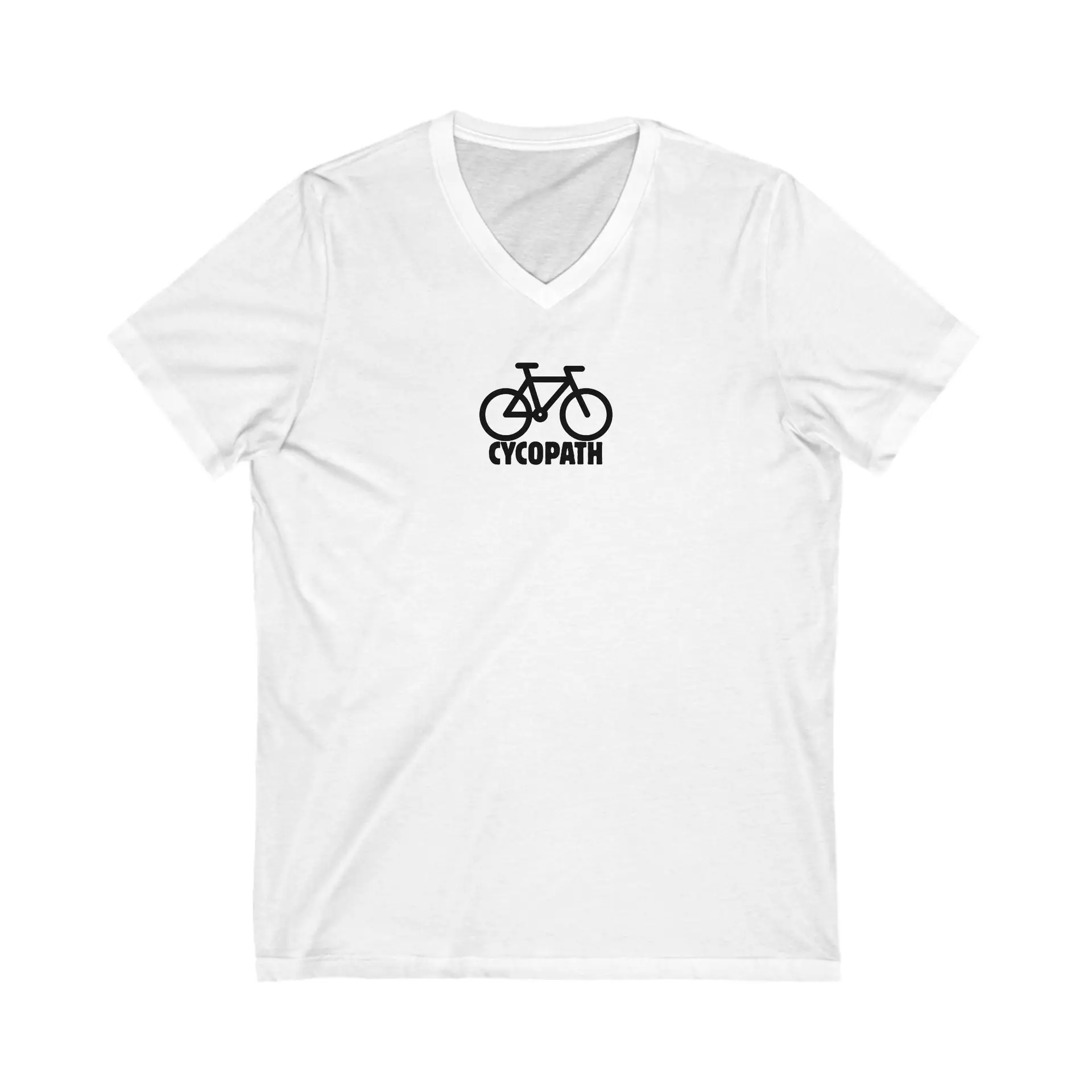 Show off your cycling passion with this eye-catching CYCOPATH V-neck tee. Featuring a minimalist bicycle graphic and bold text, this shirt is perfect for casual wear and making a statement.