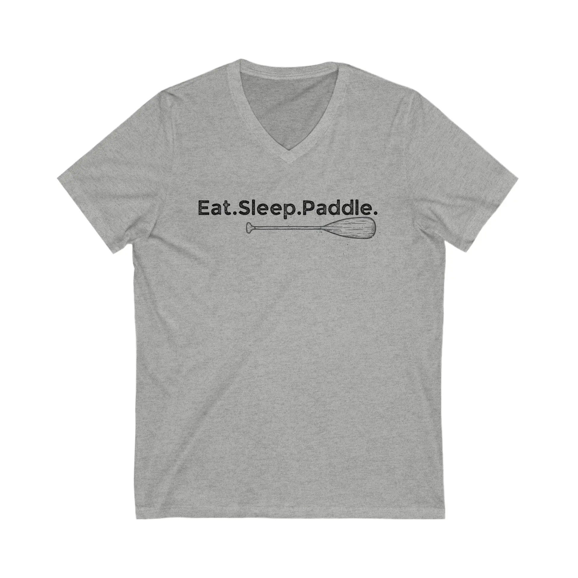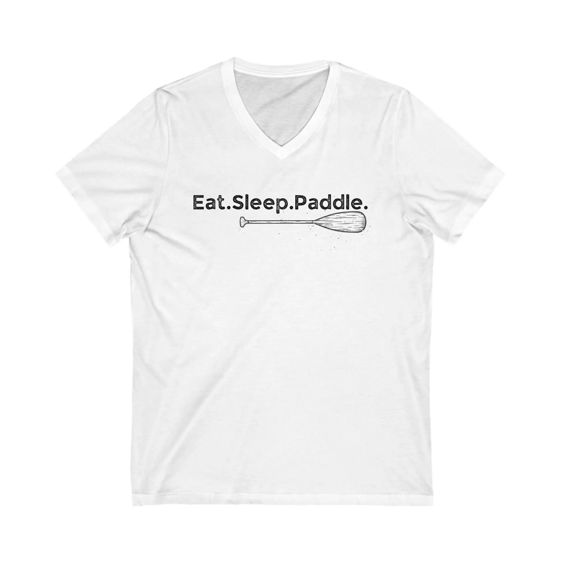 Embrace the paddling lifestyle with this comfortable V-neck tee! Featuring a hand-drawn style paddle graphic and the slogan “Eat. Sleep. Paddle.”, perfect for any outdoor enthusiast.
