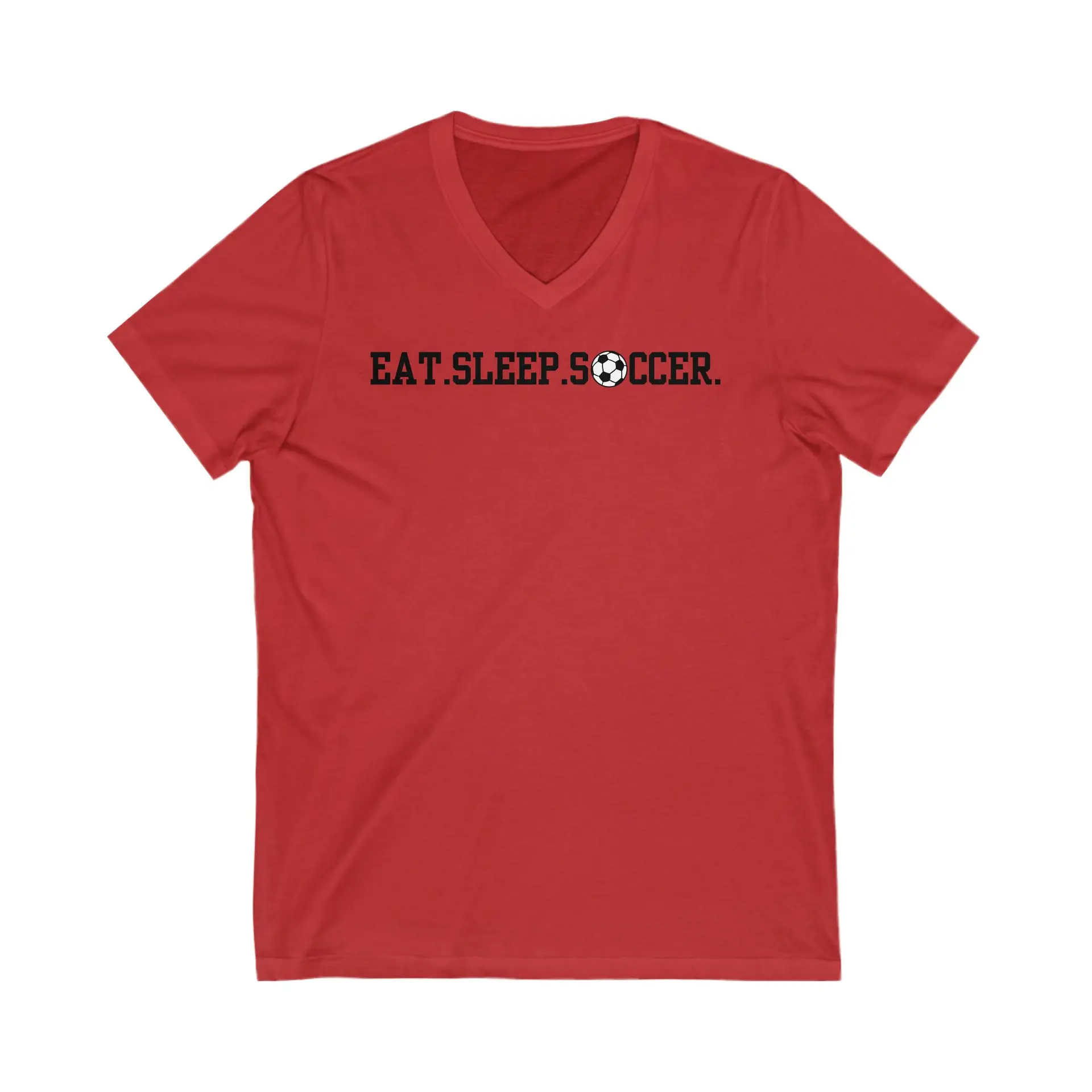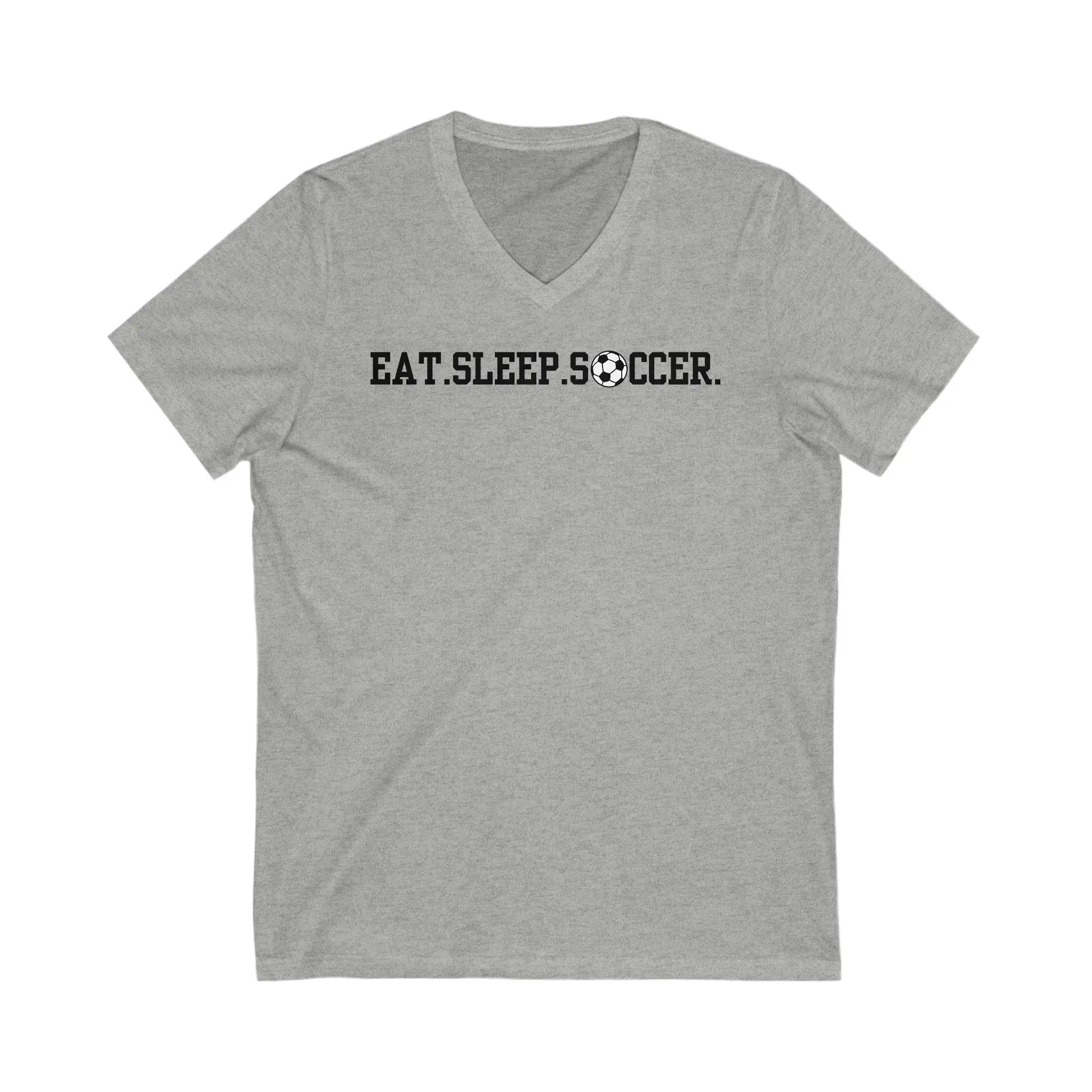 Show your love for the beautiful game with this stylish V-neck tee. Featuring a bold ‘EAT.SLEEP.SOCCER’ design with a soccer ball graphic, this shirt is perfect for casual wear.