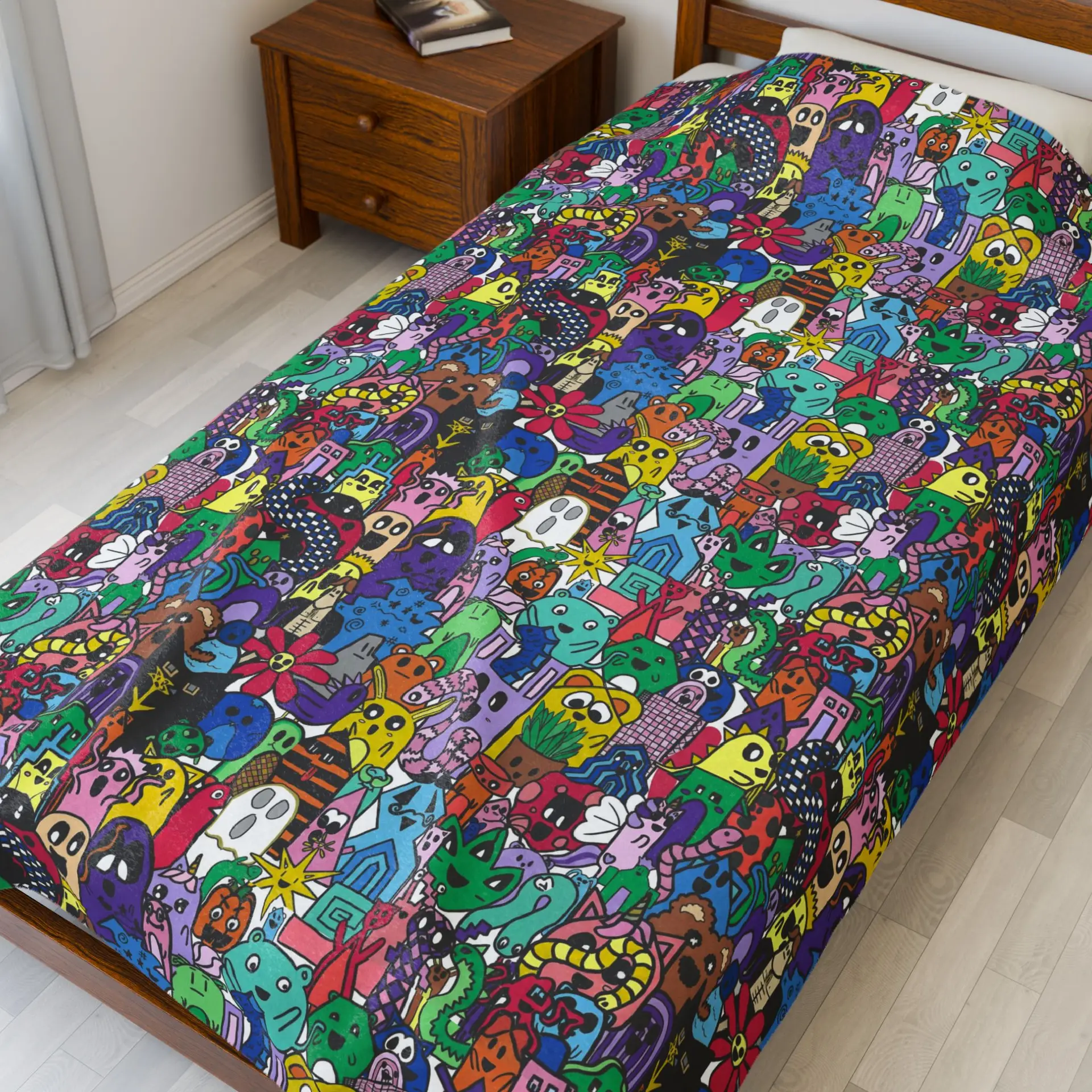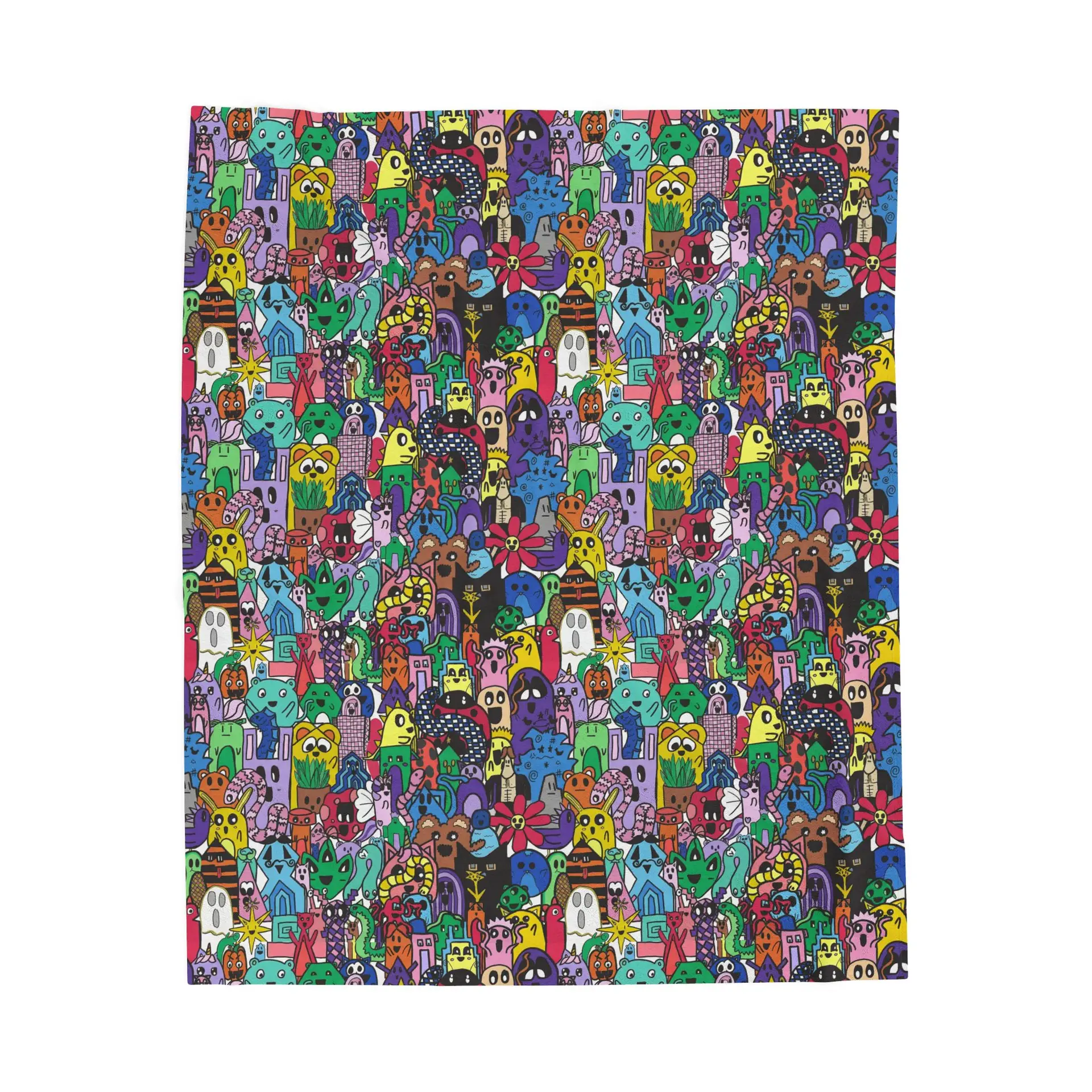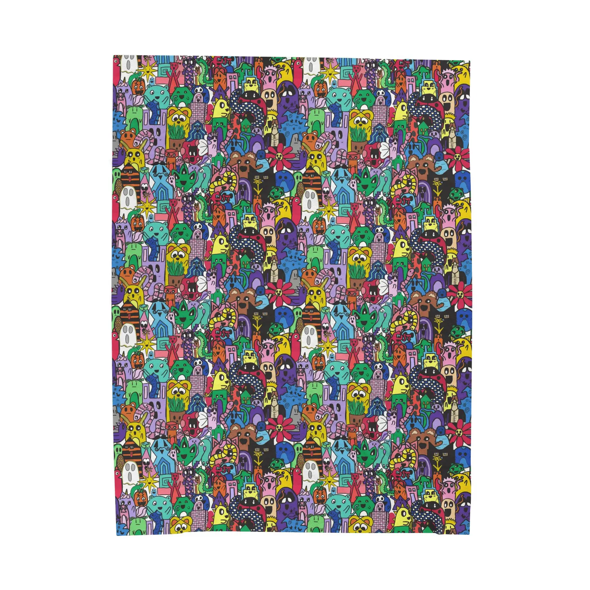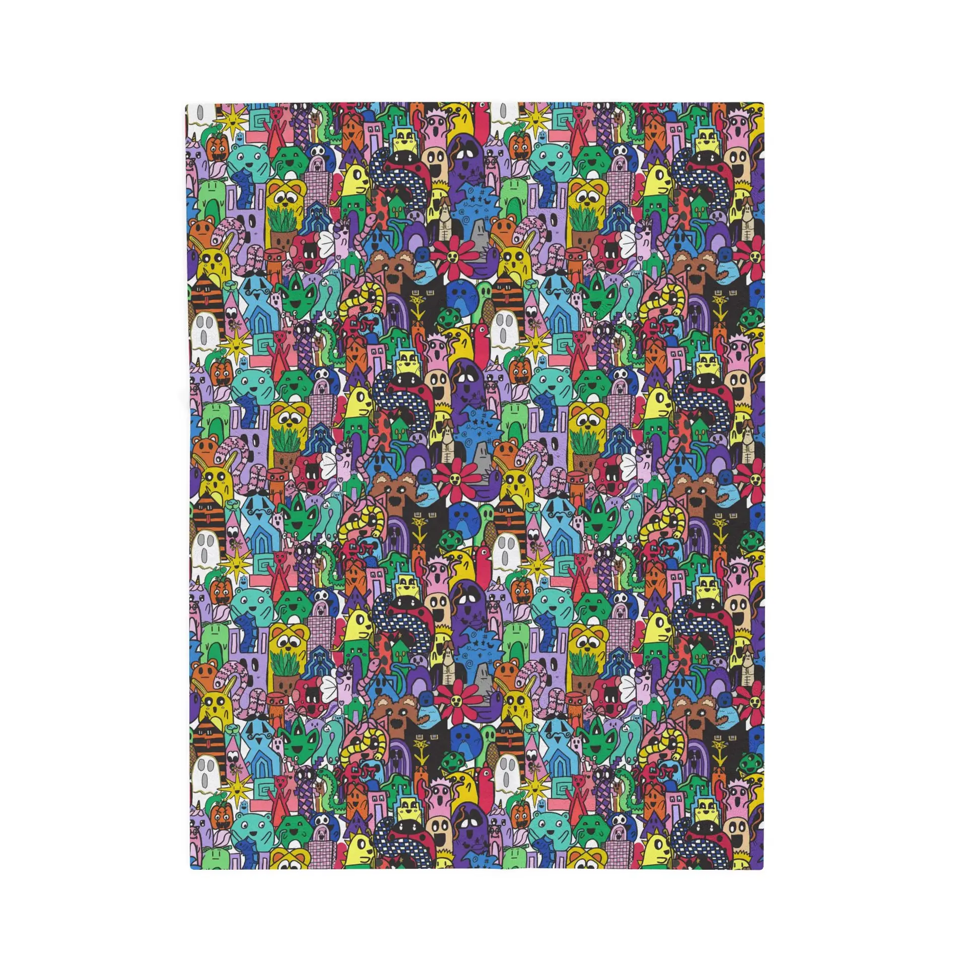 This velveteen plush blanket wraps you in a riot of color and personality. A dense, velvety face showcases a hand-drawn, whimsical all-over pattern of playful creatures, tiny houses, and quirky details—each shape layered in bright jewel tones that stay vivid after washing. The reverse is a soft, clean white that keeps the design focused on the plush side. It drapes like a hug, resists pilling, and holds its shape thanks to polyester construction and reinforced double-needle topstitching. Bring it to late-night sketch sessions, cozy reading nooks, or lively movie nights to add warmth and a bold splash of artful energy to the room.
